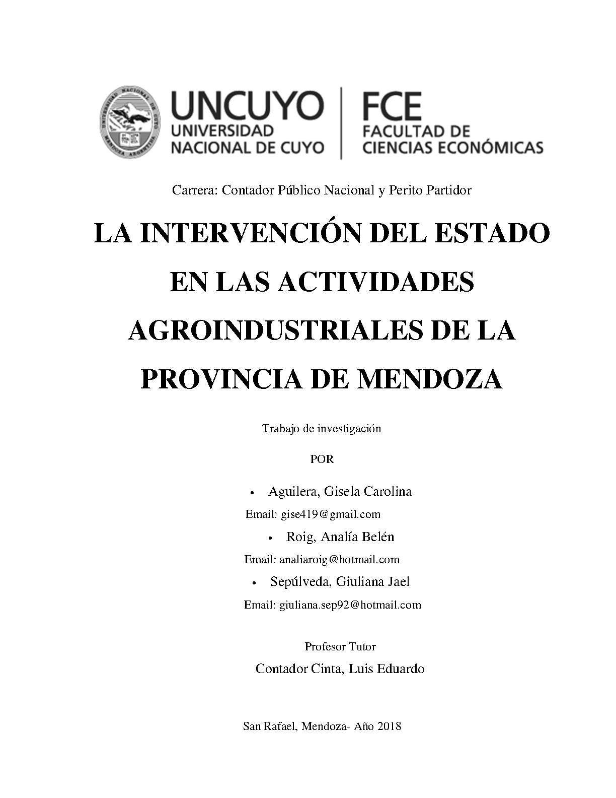 Aguilera, Gisela Carolina; Roig, Analía Belén; Sepúlveda, Giuliana Jael. (2018). La intervención del Estado en las actividades agroindustriales de la provincia de Mendoza: (Tesina de grado). Mendoza, Universidad Nacional de Cuyo. Facultad de Ciencias Económicas.