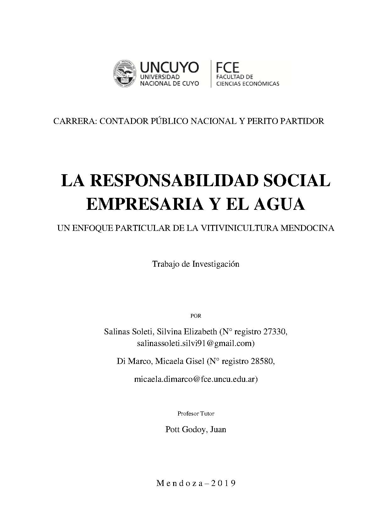 Salinas Soleti, Silvina Elizabeth; Di Marco, Micaela Gisel. (2019). La responsabilidad social empresaria y el agua: un enfoque particular de la vitivinicultura mendocina (Tesina de grado). Mendoza, Universidad Nacional de Cuyo. Facultad de Ciencias Económicas.