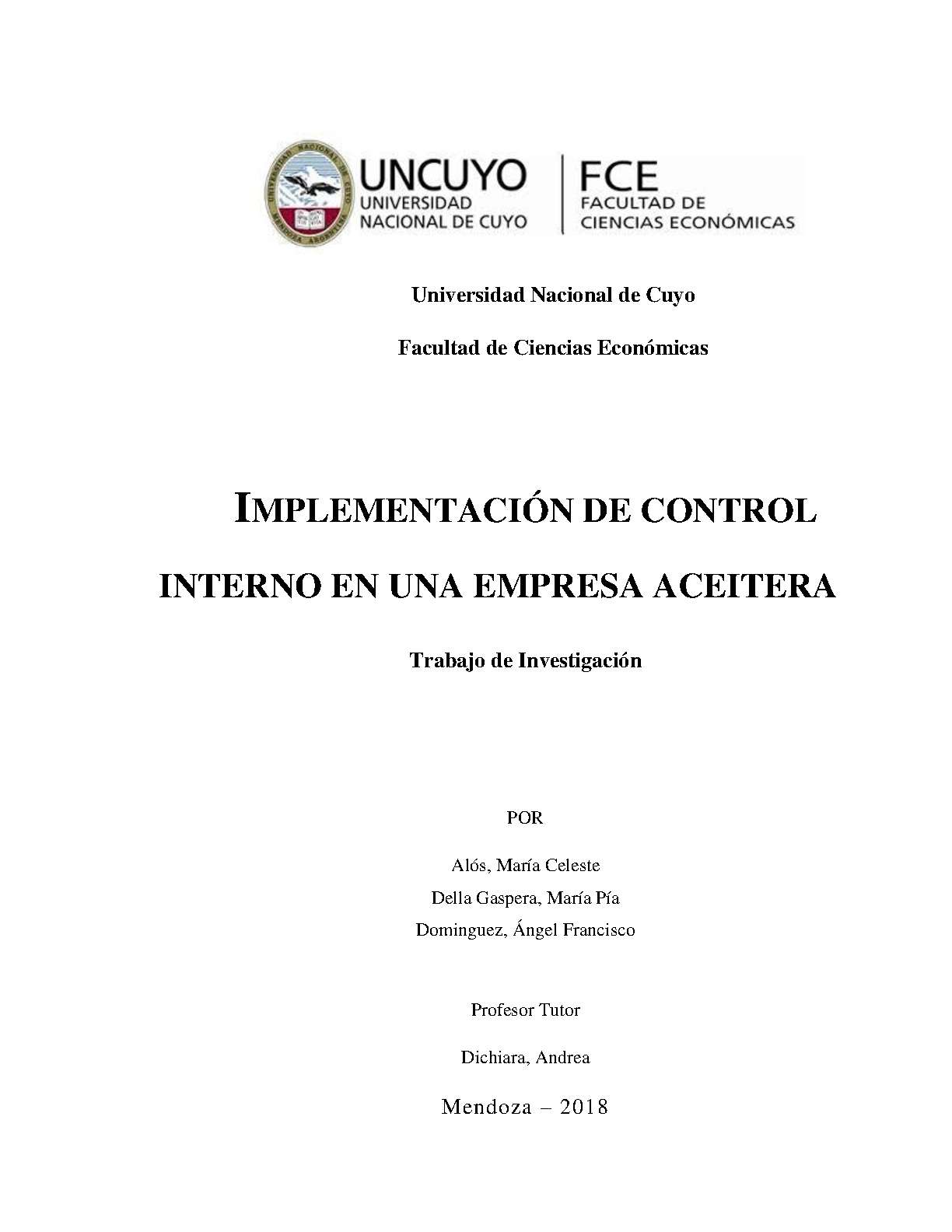 Nuestro trabajo se centrará en la implementación de control interno en una empresa aceitera familiar situada en la ciudad de Rivadavia, provincia de Mendoza. El objetivo planeado es lograr que la misma incorpore una serie de controles propuestos que le permitan reducir determinados riesgos internos, los cuales pueden impedir el normal funcionamiento y crecimiento de dicha empresa. Para esto expondremos y utilizaremos como herramientas conceptos elementales de control interno extraídos del Informe COSO. Utilizaremos algunos elementos de control tales como organigrama, flujogramas, cuadro de mando integral, fichas de control de stock, los que pensamos que son correctamente aplicables a la estructura de la aceitera en estudio, ayudando así a que la misma logre su misión. Luego de haber analizado dicha empresa, creemos que las propuestas que recomendaremos a los socios serán de gran importancia para lograr las bases necesarias para el crecimiento de su actividad y el equilibrio de la misma en el tiempo.