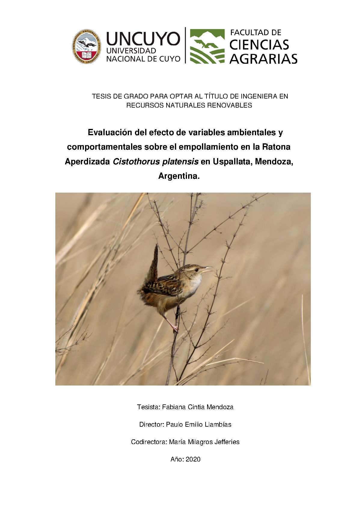 Evaluación del efecto de variables ambientales y comportamentales sobre el empollamiento en la Ratona Aperdizada Cistothorus platensis en Uspallata, Mendoza, Argentina