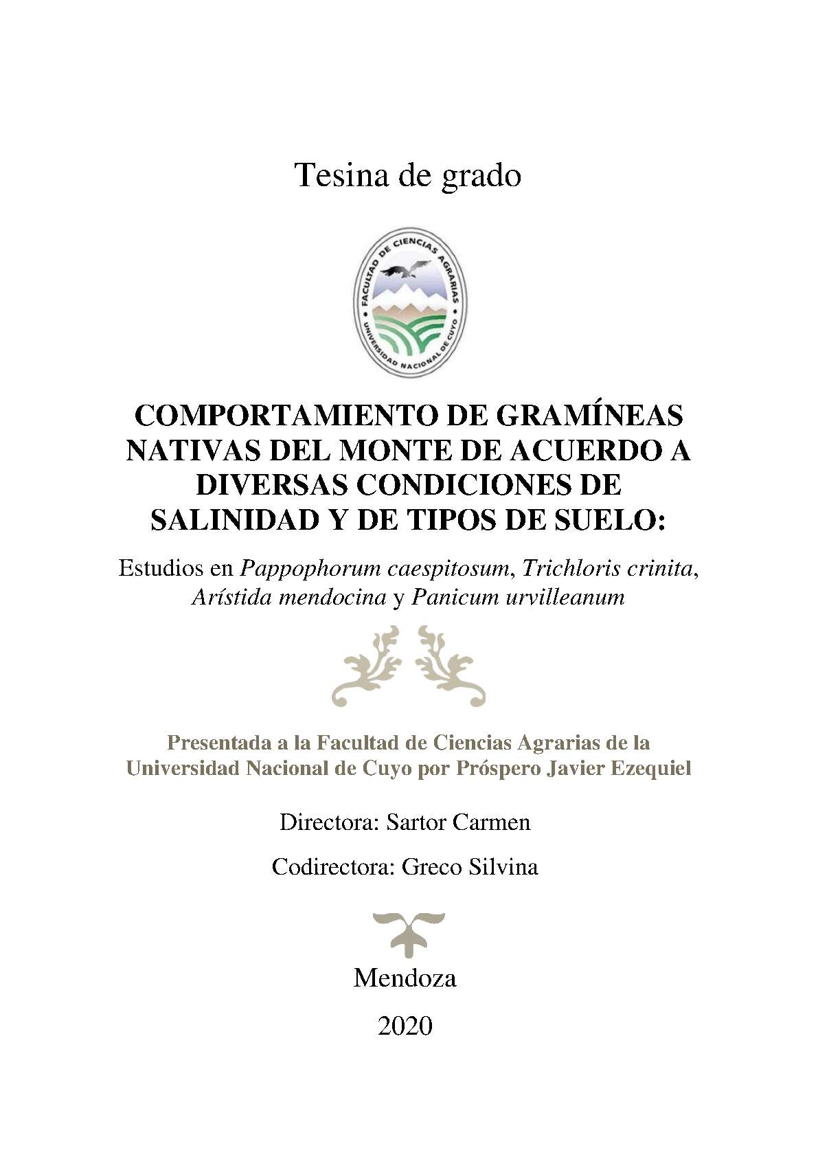 Próspero, Javier Ezequiel. (2020). Comportamiento de gramíneas nativas del monte de acuerdo a diversas condiciones de salinidad y de tipos de suelo: estudios en Pappophorum caespitosum, Trichloris crinita, Arístida mendocina y Panicum urvilleanum (Tesina de grado). Mendoza, Universidad Nacional de Cuyo. Facultad de Ciencias Agrarias .