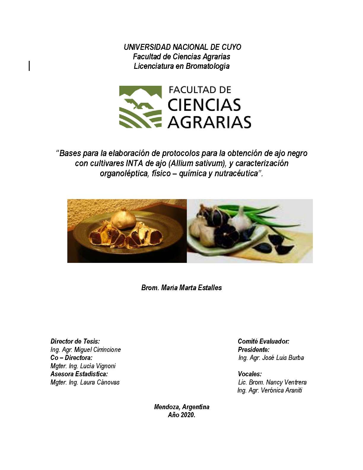 Los consumidores, actualmente, demandan productos que además de un buen contenido nutricional, presenten características beneficiosas para la salud. Si bien el ajo (Allium sativum) es un alimento que reúne las mencionadas condiciones, su pungencia y fuerte olor provocan un rechazo por parte de los consumidores. Considerando dicha tendencia, la presente tesina se ha enfocado en establecer las bases para la elaboración de protocolos de obtención de ajo negro a partir de diversos cultivares INTA y obtener un producto procesado de ajo, diferenciado por sus propiedades físico-químicas, nutracéuticas y organolépticas.