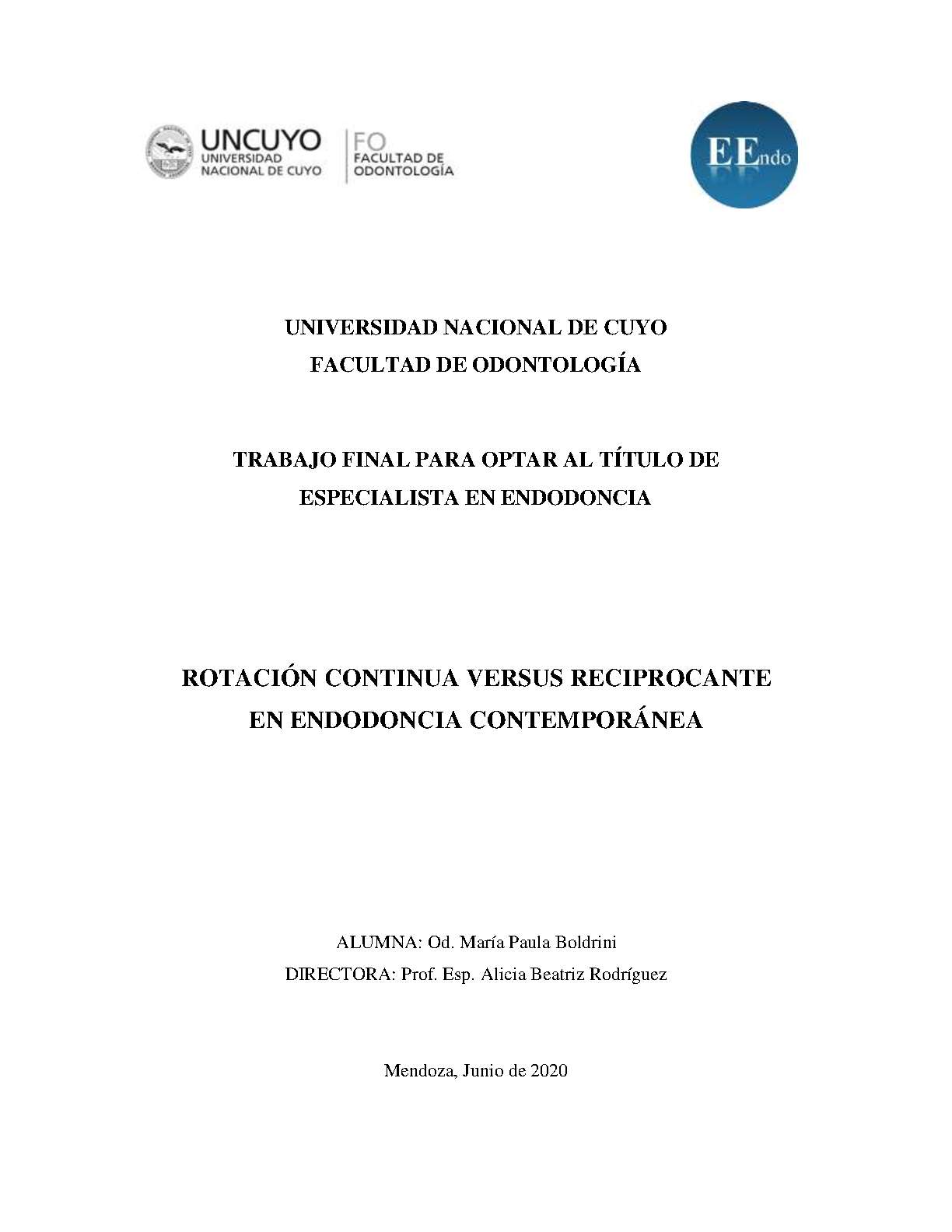 Boldrini, María Paula. (2020). Rotación continua versus reciprocante en endodoncia contemporánea: (Trabajo final de especialización). Mendoza, Universidad Nacional de Cuyo. Facultad de Odontología .