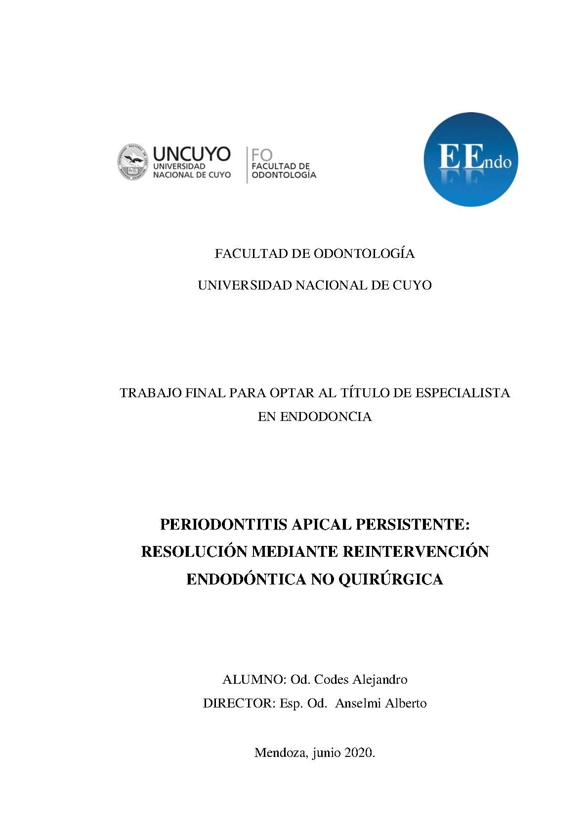 Reintervenir un diente ya tratado endodónticamente es complejo y requiere un arduo entrenamiento. Debido a las distintas dificultades que puede surgir durante el tratamiento, la tasa de éxito baja considerablemente sobre un diente tratado en primera instancia. Sumado a esto requiere un esfuerzo adicional aquellos elementos con pernos cementados sobre alguno de los conductos. Debido a esta problemática uno de los objetivos de esta tesina es evaluar la reintervención endodóntica en comparación con la cirugía periapical cuando se presenta una periodontitis periapical persistente. Informar sobre la microbiota que produce esta patología. Además, describir y comparar los distintos métodos de extracción de pernos alojados en el conducto. Muchos dentistas son reacios para intentar la eliminación de estos por miedo a debilitar, perforar o fracturar la estructura radicular restante. Mediante un caso clínico y con ayuda de la evidencia buscaremos herramientas, avances en la tecnología y la comparación entre estas, para elevar el índice de éxito y facilitar el tratamiento. El tiempo necesario para la extracción de un poste depende de la longitud del poste, su adaptación en el conducto radicular y el tipo de cemento de fijación. Es poco probable que ocurran fracturas de raíz con una buena selección de casos.