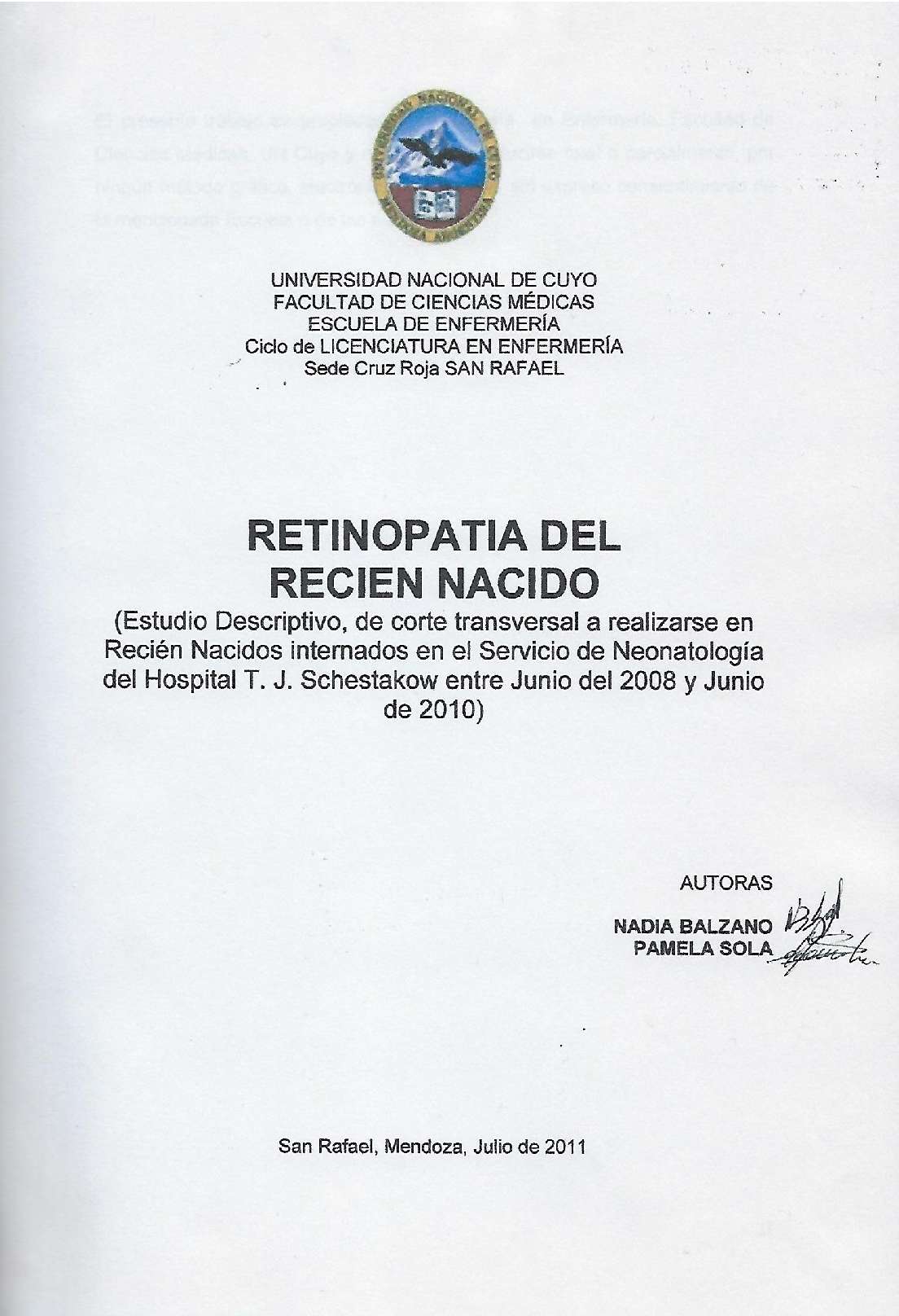 Balzano, Nadia; Sola, Pamela. (2011). Retinopatía del recién nacido: (estudio descriptivo de corte transversal a realizarse en recién nacidos internados en el Servicio de Neonatología del Hospital T. J. Schestakow entre junio de 2008 y julio de 2010) (Tesina de grado). Mendoza, Universidad Nacional de Cuyo. Facultad de Ciencias Médicas. Escuela de Enfermería..