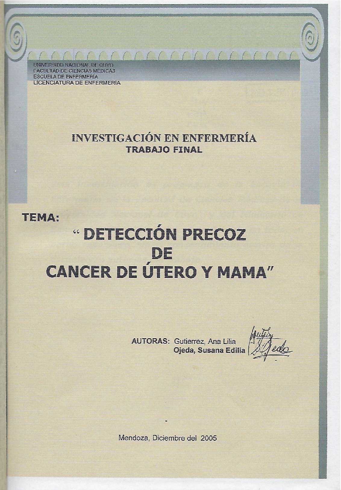 NEOPLASIAS DE LA MAMA - NEOPLASIAS UTERINAS - DETECCIÓN PRECOZ DEL CÁNCER - PREVENCIÓN DE ENFERMEDADES - PERSONAL DE ENFERMERÍA - EXAMEN GINECOLÓGICO - AUTOCUIDADO - HOSPITAL CENTRAL (MENDOZA, ARGENTINA) - PROGRAMAS NACIONALES DE SALUD - PROGRAMAS PREVENTIVOS DE SALUD
