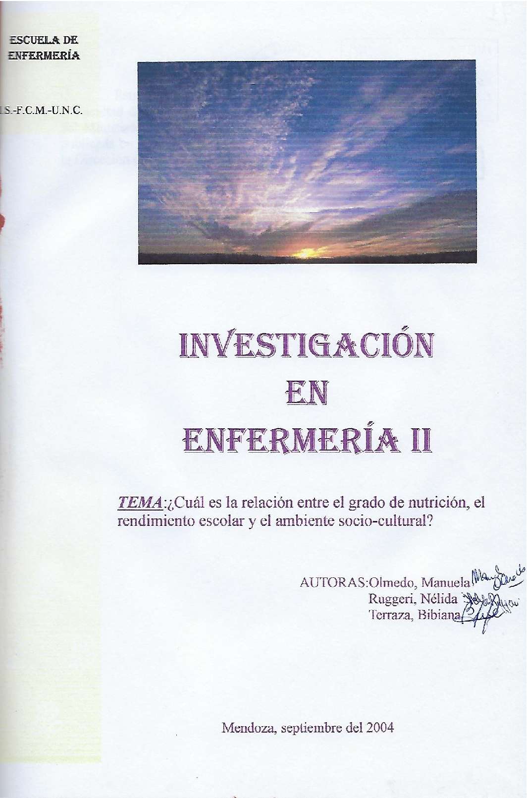 El desarrollo y el crecimiento del niño se caracterizan por una secuencia ordenada de eventos cronológicos, de numerosos detalles en su expresión física y cognitiva, y por la gran variabilidad de resultados en cuanto a la capacidad física y funcional del individuo. La interacción de múltiples factores bio-psico-sociales y nutricionales que condicionan el crecimiento y el desarrollo, determinan la óptima realización del potencial genético de cada ser humano. Esencialmente depende de la herencia y del medio social donde se desenvuelve el niño y de las tradiciones culturales que lo rodean y de la capacidad de satisfacer sus requerimientos nutricionales en cada momento especifico de la vida. Se conoce el efecto de los procesos infecciosos repetitivos en la primera infancia (esencialmente diarreas y enfermedades respiratorias agudas) que se acompañan, con frecuencia, de retraso del crecimiento del niño. En general los niños en edad escolar no presentan una alta morbilidad por desnutrición, pero si un niño malnutrido tendrá dificultades en el aprendizaje. Hay una cantidad considerable de niños en edad escolar con diferentes grados de desnutrición, que consumen alimentos ricos en cantidad pero pobres en calidad. El presente trabajo tiene como objetivo determinar cuál es la relación entre el grado de nutrición, el rendimiento escolar y el ambiente socio-cultural, en los niños de primer año de la E.G.B., de la escuela 2 de abril, del distrito del Buen Orden, de General San Martín, Mendoza, en el segundo semestre de 2003. Es un estudio de tipo descriptivo y transversal con el fin de determinar el número de casos de desnutrición y niños con riesgo nutricional.