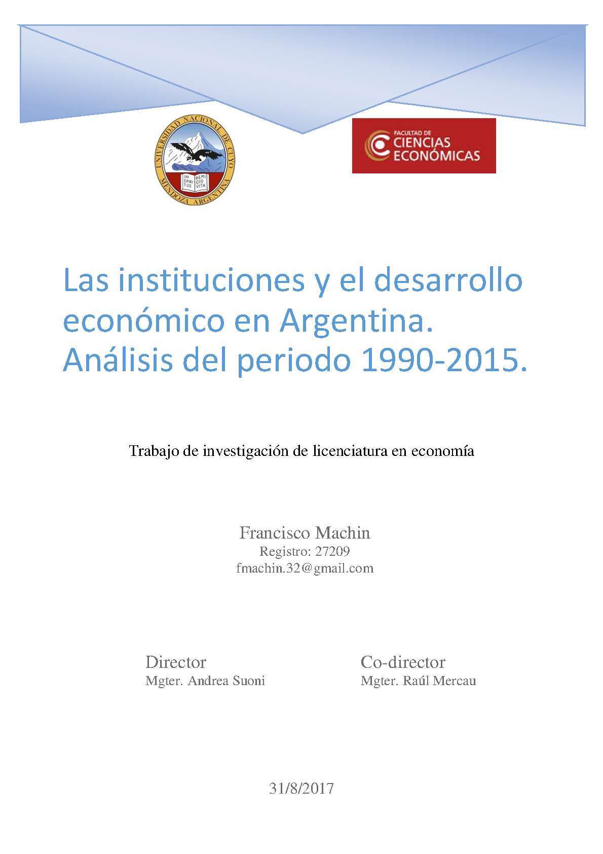 Los objetivos generales que se plantean en el recorrido de este trabajo son, por un lado, caracterizar el marco institucional argentino entre los años 1990 a 2015 bajo la propuesta de la Economía Política Institucionalista; y por otro, identificar un posible cambio institucional y sus efectos en el grado de desarrollo. El mismo refleja un estudio de caso argentino, que a través de un análisis descriptivo histórico general de los aspectos políticos, económicos y sociales para comprender el marco institucional; y el uso de inferencia estadística, se contrasta la hipótesis de que las políticas económicas y