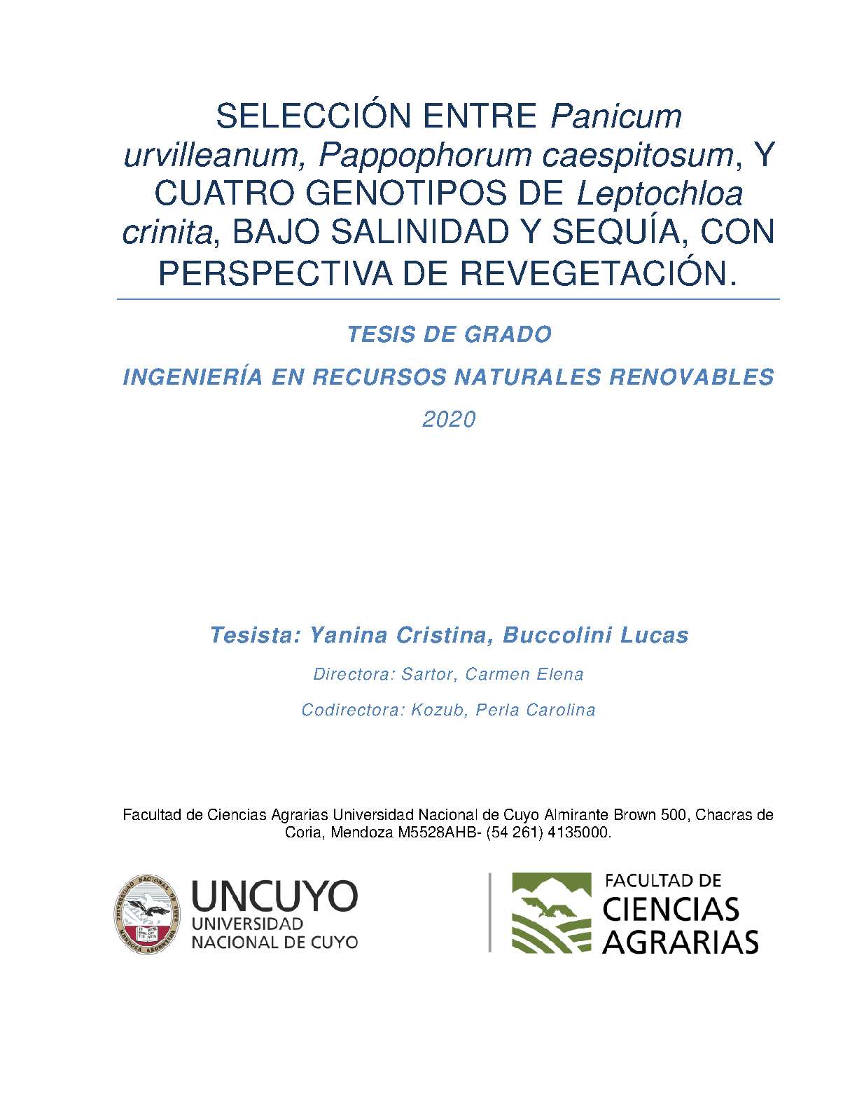 Selección entre Panicum urvilleanum, Pappophorum caespitosum, y cuatro genotipos de Leptochloa crinita, bajo salinidad y sequía, con perspectiva de revegetación