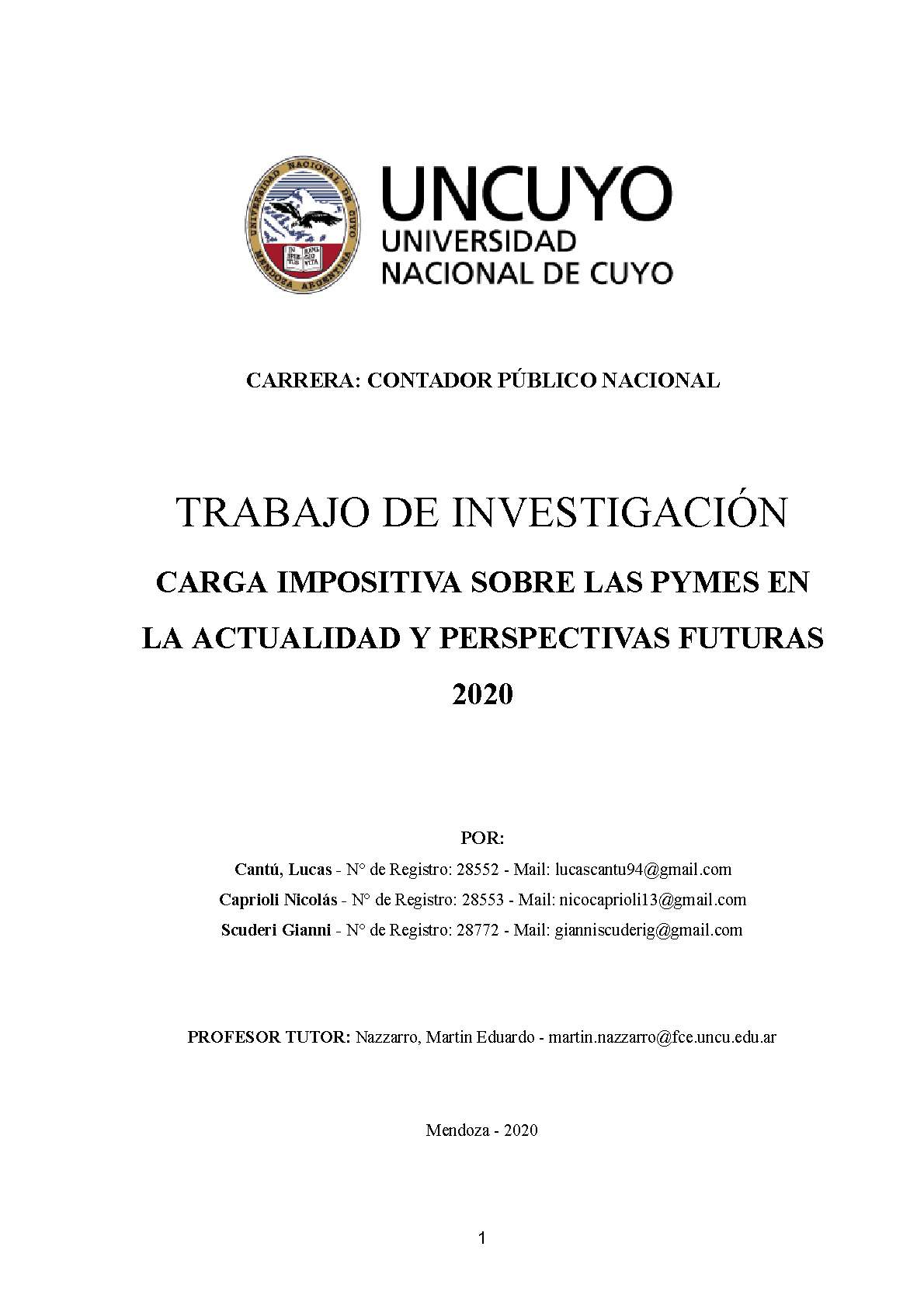 Cantú, Lucas Gabriel; Caprioli, Pablo Nicolás; Scuderi, Gianni. (2020). Carga impositiva sobre las pymes en la actualidad y perspectivas futuras: (Tesina de grado). Mendoza, Universidad Nacional de Cuyo. Facultad de Ciencias Económicas.