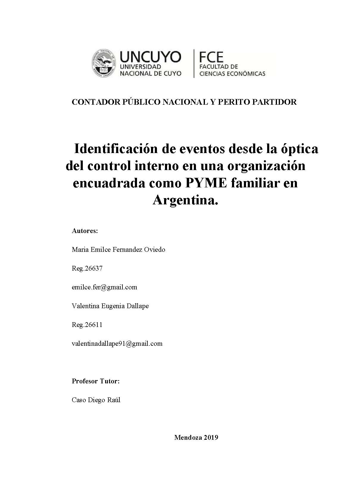 El presente trabajo de investigación desarrolla los conceptos básicos necesarios para dar respuesta al objetivo del mismo, expresar los beneficios que surgen de la implementación del análisis de riesgos, y más precisamente de la identificación de eventos en una PYME familiar argentina. Está compuesto por cuatro capítulos, en los primeros tres, de carácter teóricos, se desarrollan las definiciones de empresa, familia, PYME, empresa familiar y control interno. En el cuarto capítulo práctico, se vuelca la teoría desarrollada en casos particulares de empresas alcanzadas en el encuadre del presente trabajo. De este último se desprenden las conclusiones, expresando las ventajas de la implementación de la teoría propuesta.