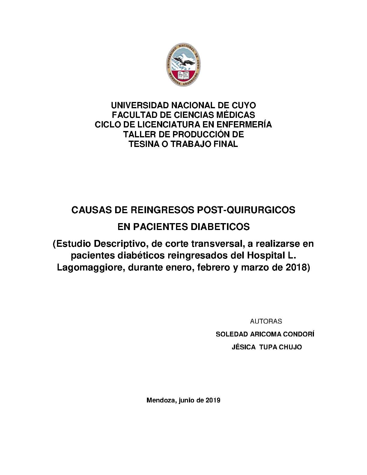Aricoma Condorí, Soledad; Tupa Chujo, Jésica. (2019). Causa de reingreso post-quirúrgico en pacientes diabéticos: estudio descriptivo, de corte transversal, a realizarse en pacientes diabéticos reingresados del Hospital L. Lagomaggiore, durante enero, febrero y marzo de 2018 (Tesina de grado). Mendoza, Universidad Nacional de Cuyo. Facultad de Ciencias Médicas. Escuela de Enfermería..