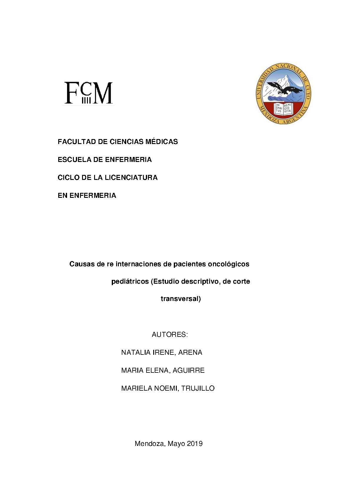 El cáncer infantil constituye un grupo heterogéneo de enfermedades con etiología, tratamiento y pronóstico diferente. El diagnóstico de cáncer puede adquirir un significado especial, en muchas ocasiones es el enfrentamiento con una muerte inminente. De hecho, el cáncer sigue siendo la segunda causa de muerte en la infancia, en los países en desarrollo, después de los accidentes. El diagnóstico y tratamiento rápido y adecuado intentan no sólo curar al paciente, sino que las secuelas físicas y psicológicas sean las mínimas posibles. La responsabilidad en la detección precoz de estas enfermedades reside en el pediatra de cabecera y los individuos cercanos al enfermo; sin embargo, su supervivencia y su calidad de vida dependen, en la gran mayoría de casos, del manejo adecuado y cuidadoso por parte de un conjunto complejo de especialistas, coordinados por el oncólogo. El cuidado de un niño debe orientarse hacia la atención integral del paciente y a la familia, es por ello que los profesionales deben tener los conocimientos sobre el manejo durante el diagnóstico y tratamiento, que acompañen y que pueda adelantarse ante posibles riesgos que pueden llevarlo a una reinternación. Múltiples son las causas que pueden incidir en la reinternación de los niños con patologías crónicas como el cáncer, las cuales estén relacionadas a la propia enfermedad, a su entorno social y cultural. Este trabajo de investigación tiene como objetivo determinar cuáles son las causas de re internaciones en pacientes pediátricos con cáncer del SIP 5, en el periodo abril, mayo, junio y julio del año 2018 en el Hospital Humberto Notti. La investigación es de naturaleza cuantitativa, descriptiva, de corte transversal, de fuente primaria y de campo.