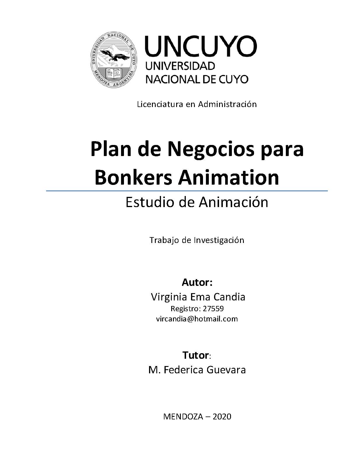 El presente trabajo, está enfocado en el desarrollo un plan de negocios para llevar a cabo un estudio de animación con orientación al área publicitaria, en la provincia de Mendoza.