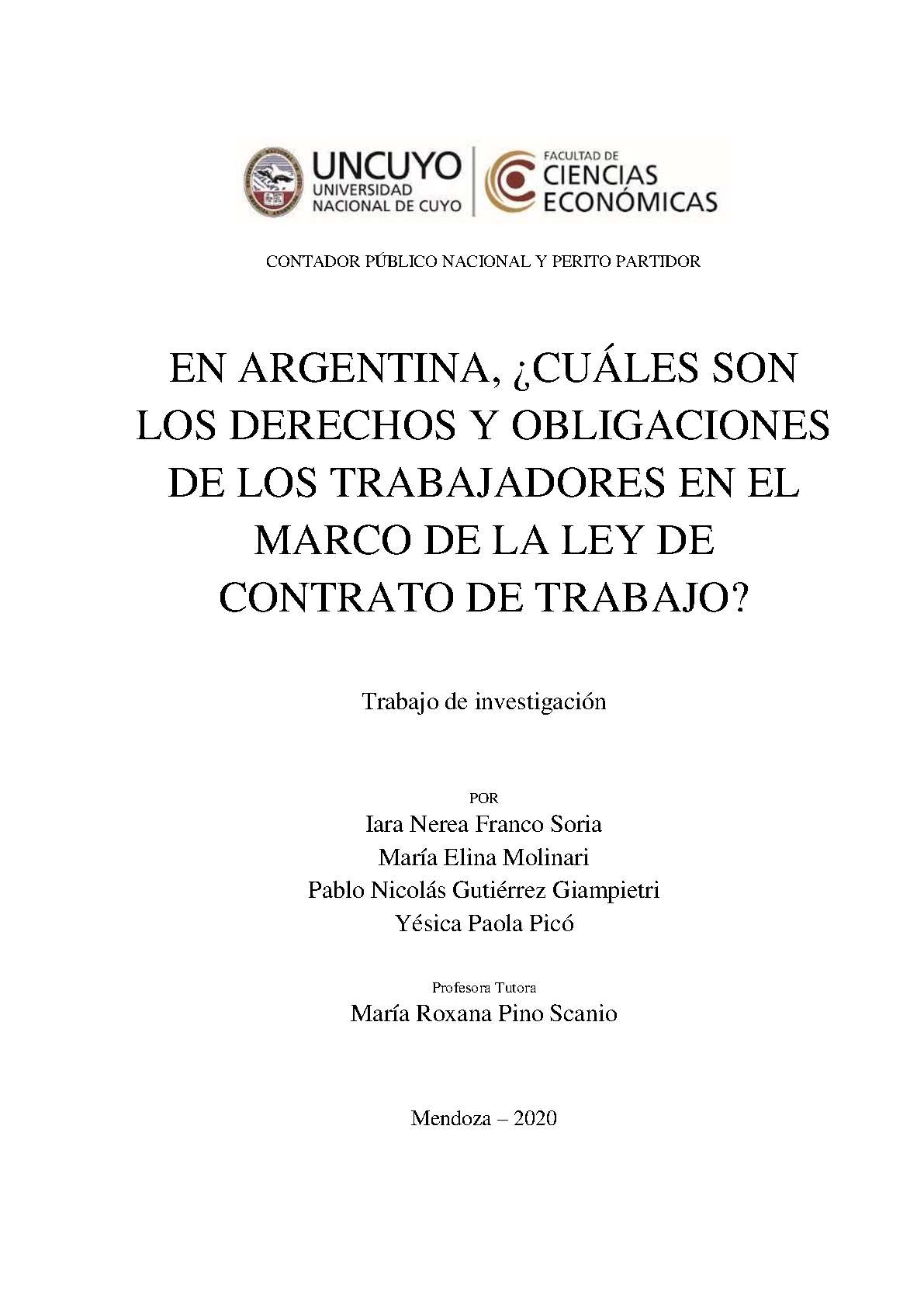 A lo largo de nuestra carrera y durante nuestra experiencia en el campo laboral, hemos aprendido que la legislación argentina es muy amplia en cuanto a los derechos y obligaciones de los trabajadores, pero, sin embargo, las personas en general desconocen su alcance y contenido. Esto nos motivó a efectuar un trabajo en el que pudiéramos explicar los puntos principales de nuestra Ley de Contrato de Trabajo, de forma clara y precisa, para que cualquier persona que necesitara alguna guía o poseyera inquietudes pudiera acudir al mismo y encontrar contenido fehaciente y confiable. Para poder llevar adelante nuestra investigación planteamos el problema que nosotros consideramos principal sobre este tema: el desconocimiento de la población en general. Y en base a eso, pudimos desarrollar nuestra hipótesis, explicada en el párrafo anterior. Debimos efectuar un fuerte marco teórico y analizar con profundidad el contexto y la historia de la Ley de Contrato de Trabajo, ya que a lo largo del tiempo ha atravesado por diferentes modificaciones y derogaciones que son necesarias conocer para poder comprender su fortaleza y su nivel de profundidad hoy en día. Basados en bibliografía y diversos documentos, pudimos explicar los diversos puntos de la Ley, sumando aclaraciones que surgen de los usos y costumbres y de algunos fallos de la C.S.J.N., lo que permite que este trabajo tenga un gran grado de realidad. También logramos recolectar datos de las legislaciones de Uruguay y Chile, con el objetivo de compararlas con la nuestra y obtener una visión más amplia de la misma. Finalmente pudimos comprobar que nuestra legislación, a pesar de tener algunas fallas y falencias, contempla una gran cantidad de derechos y protege a los trabajadores de la desigualdad y posible opresión.