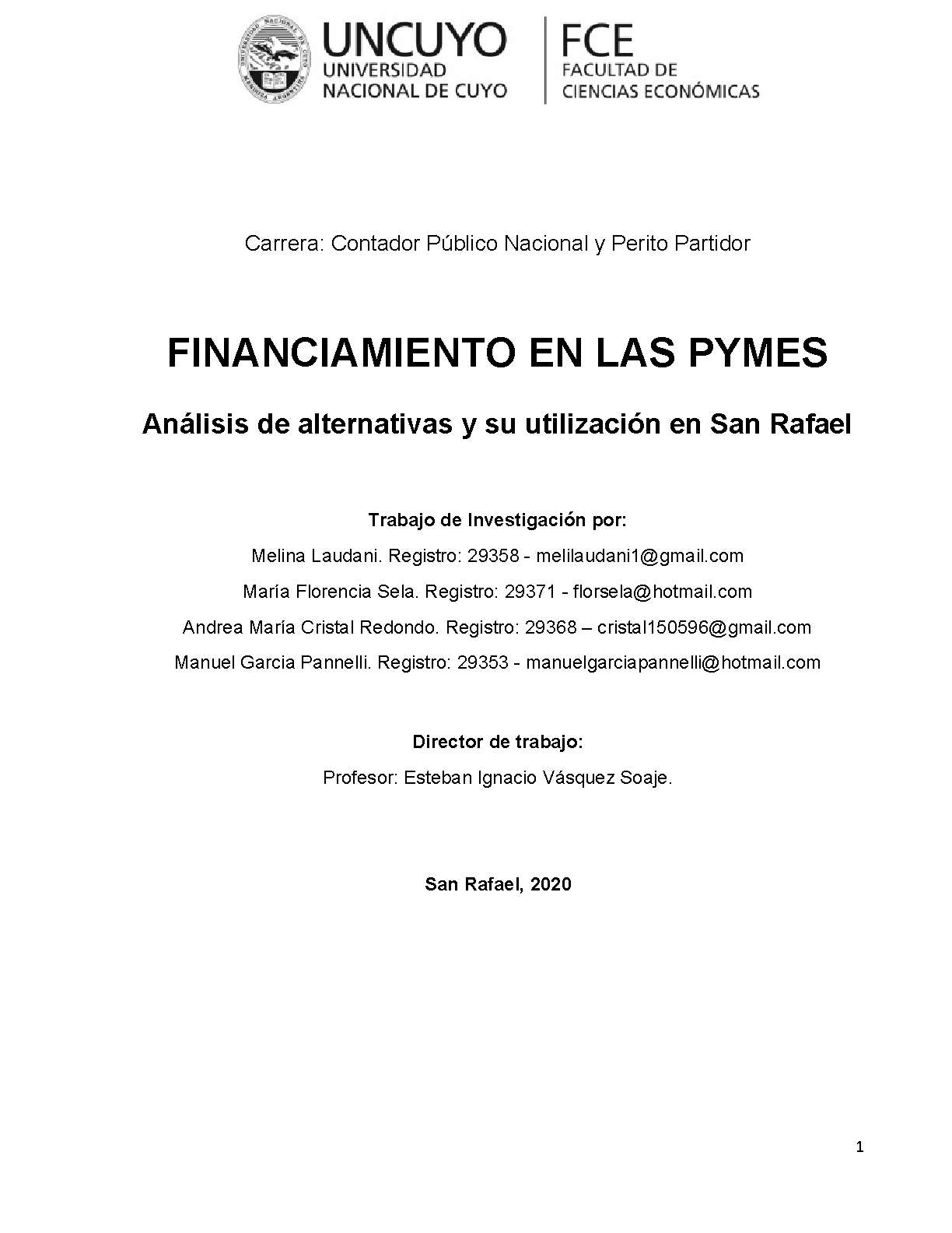 El financiamiento es importante ya que permite, entre otras cosas, aumentos en la productividad, incrementos en la innovación tecnológica, mayor posibilidad de insertarse y sobrevivir en los mercados internacionales; también se obtienen otros beneficios como reducir cargas fiscales ya que los intereses que se paguen por el financiamiento pueden disminuir la cantidad de impuestos que se abonan sobre las utilidades. La presente investigación propone analizar en forma simple y práctica qué impacto tiene el financiamiento en las pequeñas y medianas empresas. Buscamos definir a este tipo de organizaciones, los beneficios que se posee al ser incluido en la categoría de PyMEs y los distintos tipos de financiamiento a los que pueden acceder. El presente estudio consiste en un análisis cualitativo y descriptivo. A partir de los datos obtenidos en la de la carrera de Contador Público Nacional, entrevistas realizadas a reconocidas PyMES de San Rafael y entidades financieras, disposiciones legales y otros medios de información es que pudimos explicar la importancia del conocimiento de los medios de financiamiento y cuál es la forma de financiación a la que pueden acceder, de manera tal que este estudio pueda servir como herramienta y guía para un mejor conocimiento por parte de estas pequeñas y medianas empresas sobre los medios de financiamiento existentes.