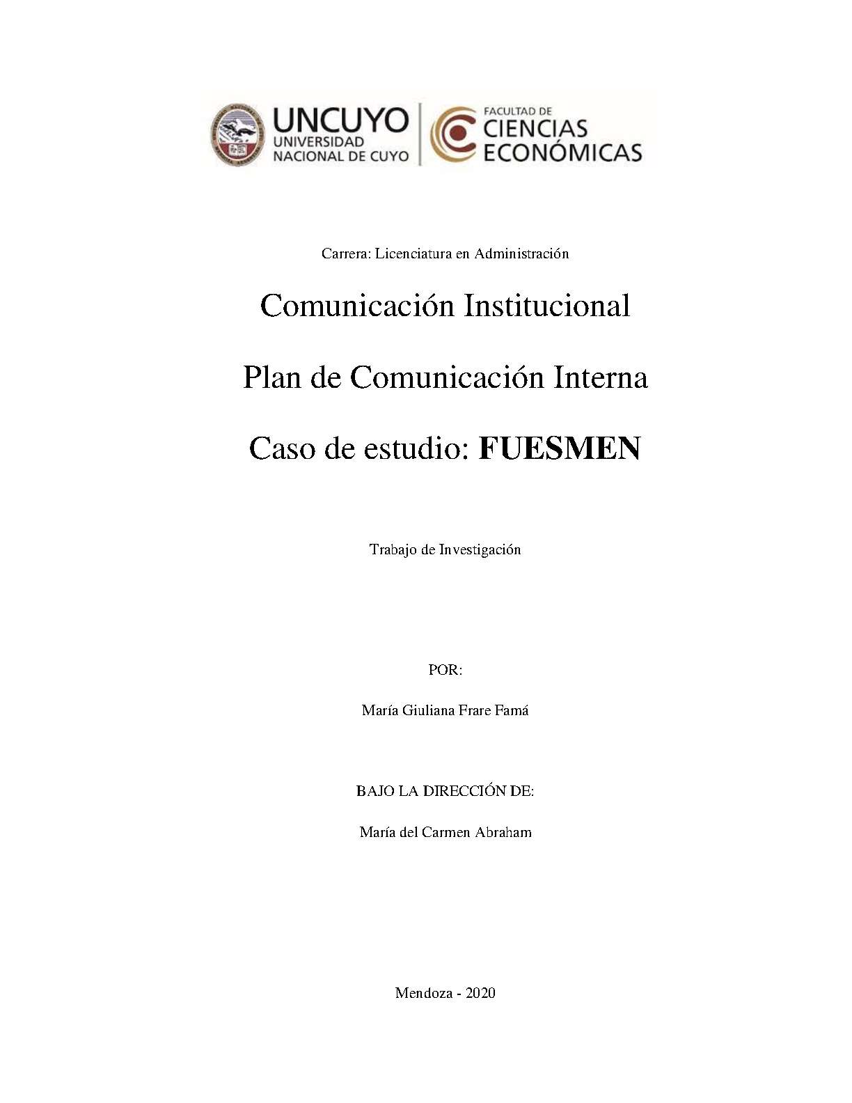 Frare Famá, María Giuliana. (2020). Comunicación institucional: plan de comunicación Interna : caso de estudio: FUESMEN (Tesina de grado). Mendoza, Universidad Nacional de Cuyo. Facultad de Ciencias Económicas.