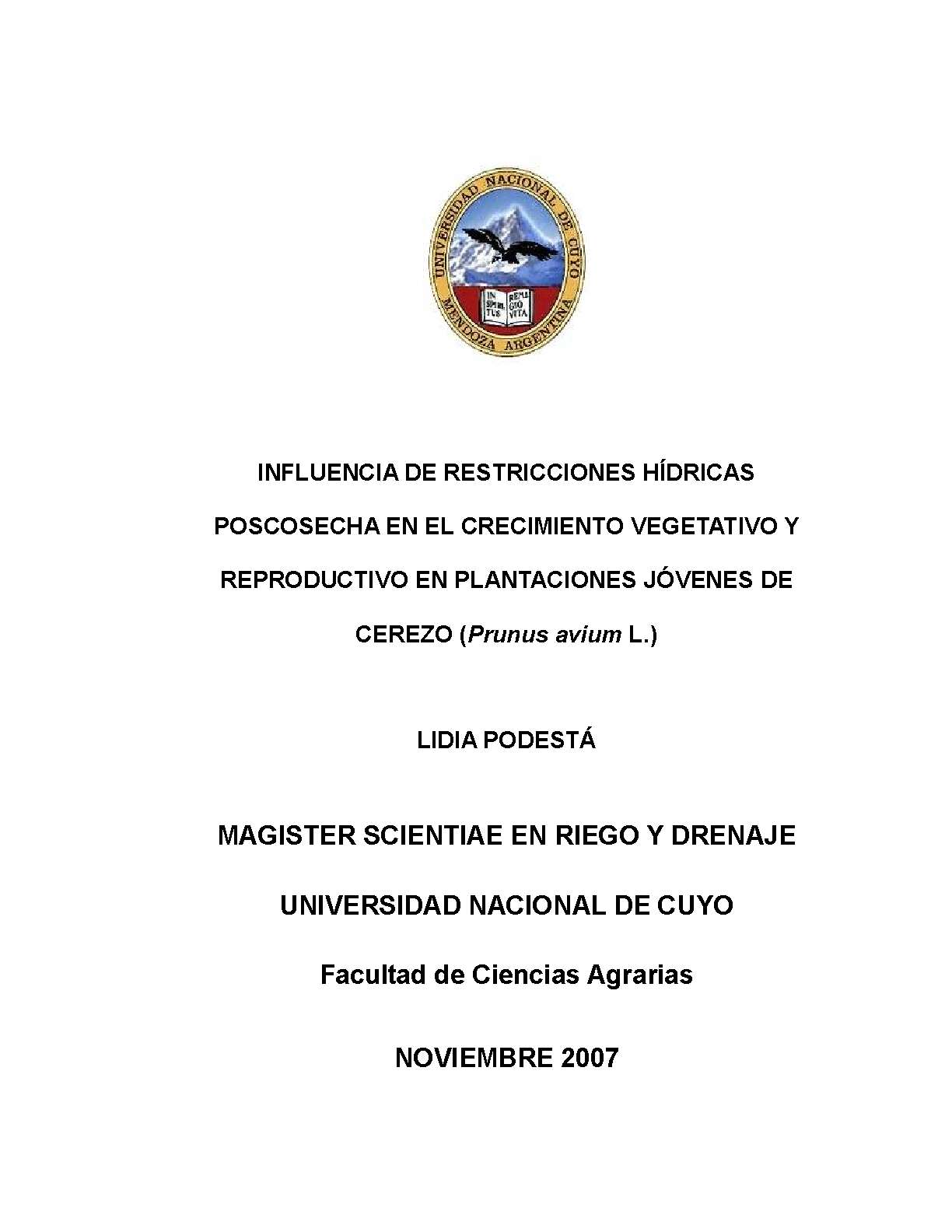 PRUNUS AVIUM - CEREZAS - DOSIS DE RIEGO - DÉFICIT DE HUMEDAD EN EL SUELO - CONDICIÓN DE LA PLANTA - VIGOR - CRECIMIENTO - FLORACIÓN - RENDIMIENTO DE CULTIVOS - MENDOZA (ARGENTINA)