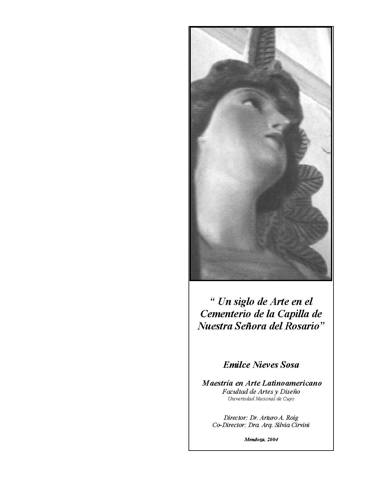 Sosa, Emilce Nieves. (2005). Un siglo de arte en el cementerio de la Capilla de Nuestra Señora del Rosario: (Tesis de Maestría). Mendoza, Universidad Nacional de Cuyo. Facultad de Artes y Diseño .
