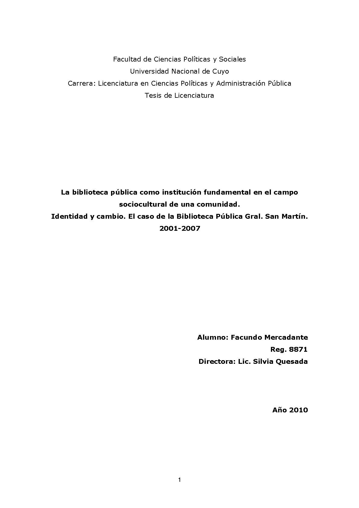 Mercadante, Facundo. (2010). La biblioteca pública como institución fundamental en el campo sociocultural de una comunidad: identidad y cambio : el caso de la Biblioteca Pública "Gral. San Martín" 2001-2007 (Tesina de grado). Mendoza, Universidad Nacional de Cuyo. Facultad de Ciencias Políticas y Sociales .