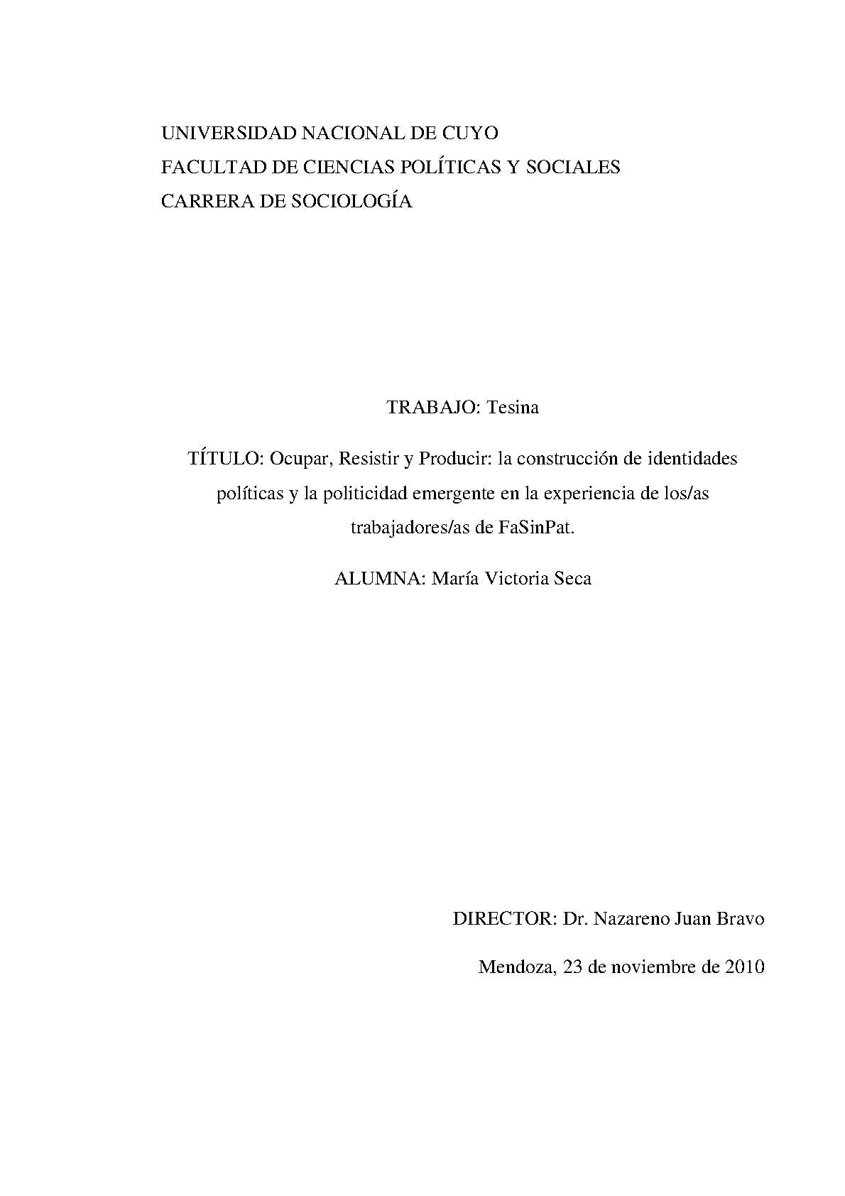 la construcción de identidades políticas y la politicidad emergente en la experiencia de los/as trabajadores/as de FaSinPat