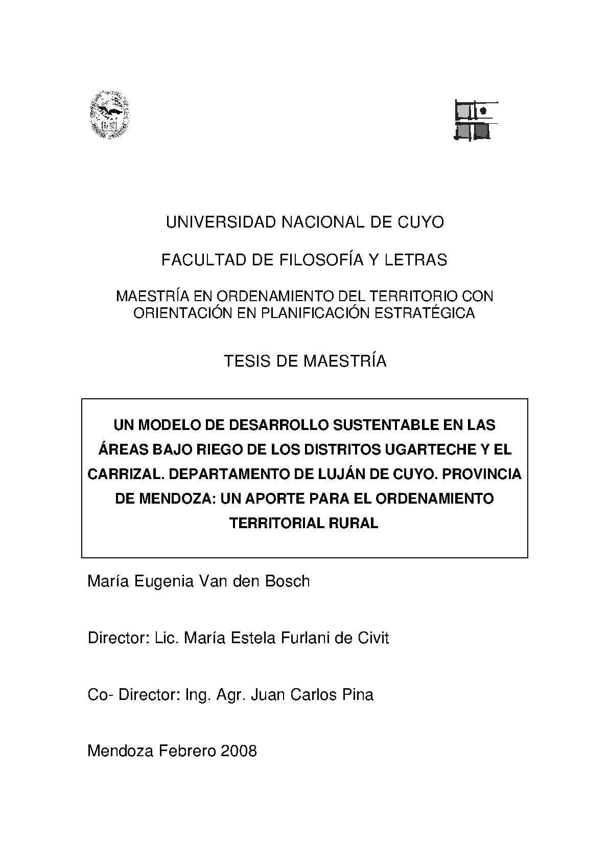 Van den Bosch, María Eugenia. (2008). Un modelo de desarrollo sustentable en las áreas bajo riego de los distritos Ugarteche y El Carrizal. Departamento de Luján de Cuyo. Provincia de Mendoza: un aporte para el ordenamiento territorial rural (Tesis de Maestría). Mendoza, Universidad Nacional de Cuyo. Facultad de Filosofía y Letras .