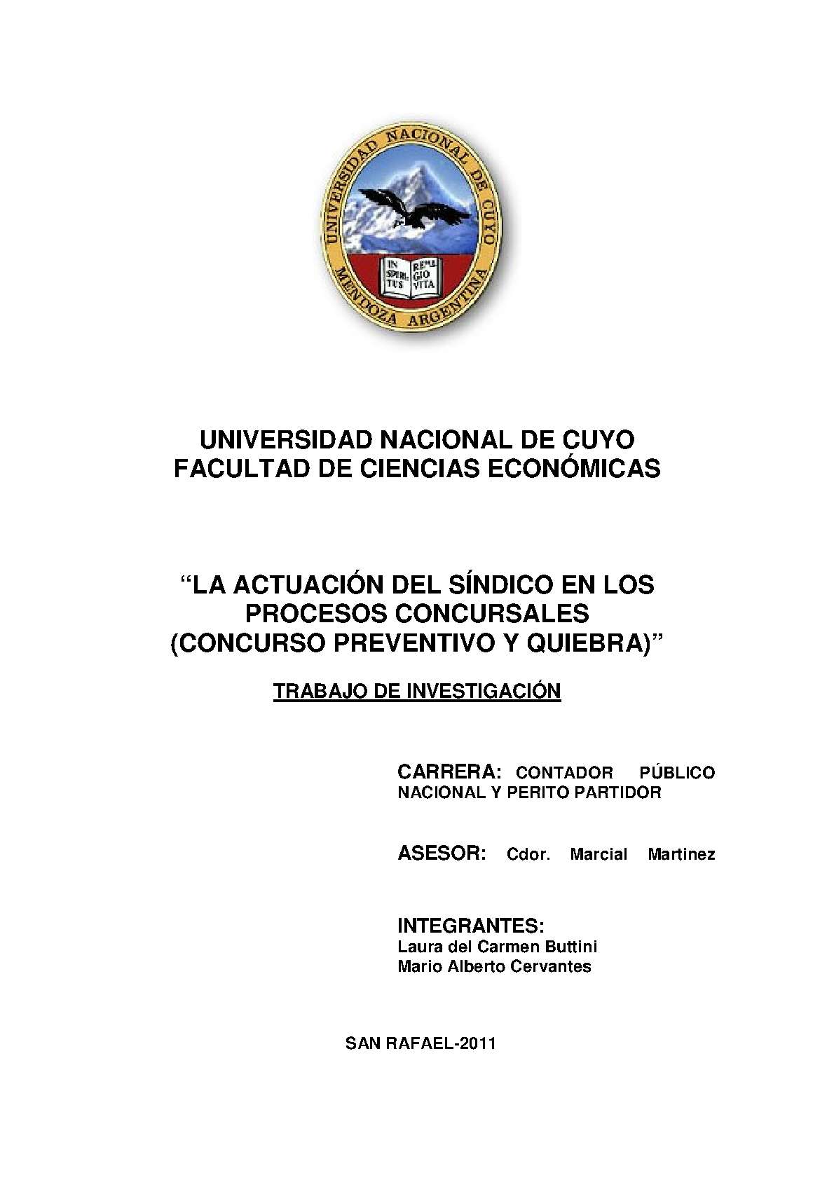 Buttini, Laura del Carmen; Cevantes, Mario Alberto. (2011). La actuación del síndico en los procesos concursales: (concurso preventivo y quiebra) (Trabajo final de grado). Mendoza, Universidad Nacional de Cuyo. Facultad de Ciencias Económicas.