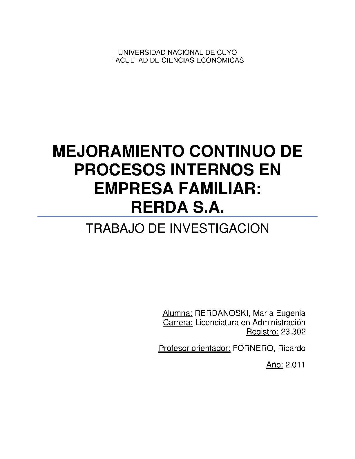 Rerdanosky, María Eugenia. (2011). Mejoramiento continuo de procesos internos en empresa familiar: Rerda S.A (Trabajo final de grado). Mendoza, Universidad Nacional de Cuyo. Facultad de Ciencias Económicas.