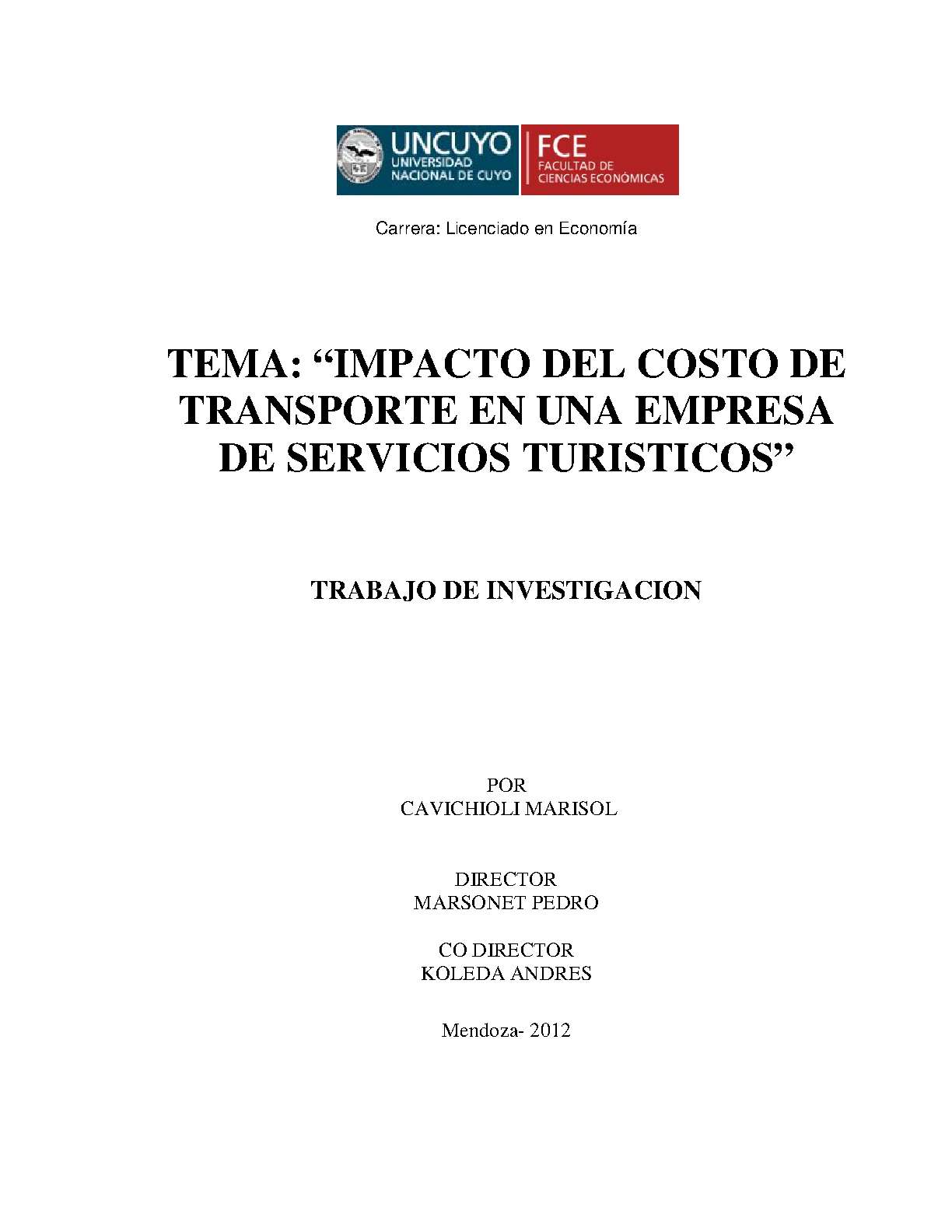 TURISMO - MENDOZA (ARGENTINA) - INDUSTRIA TURÍSTICA - SERVICIOS - SECTOR TERCIARIO - AGENCIAS DE VIAJES - ZONAS TURÍSTICAS - ANÁLISIS DE COSTO-BENEFICIO - COSTOS - EVALUACIÓN DE RIESGOS