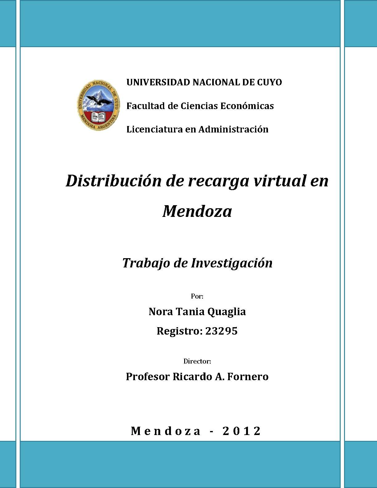 Quaglia, Nora Tania. (2012). Distribución de recarga virtual en Mendoza: (Trabajo final de grado). Mendoza, Universidad Nacional de Cuyo. Facultad de Ciencias Económicas.