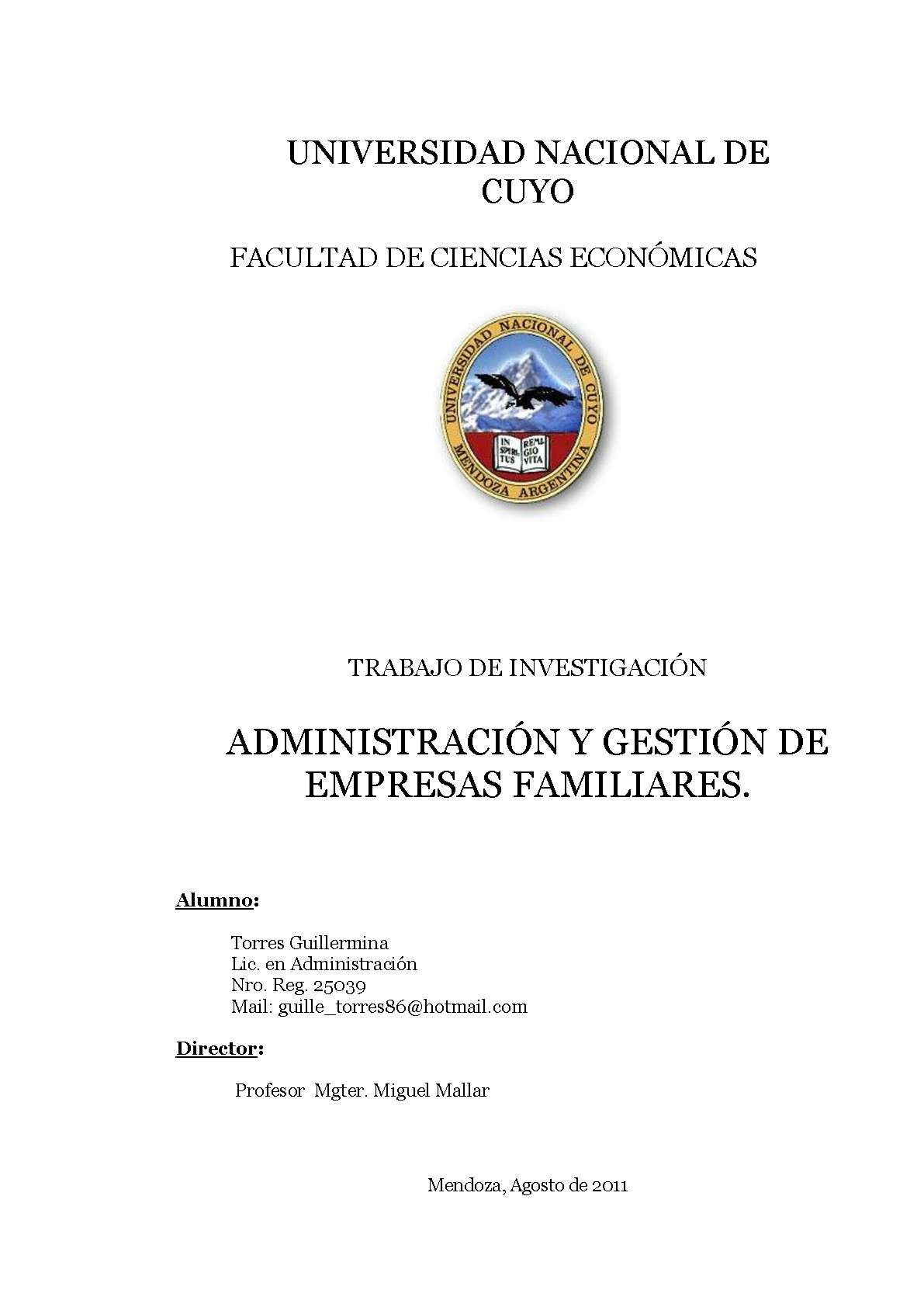 Torres, Guillermina. (2011). Administración y gestión de empresas familiares: (Trabajo final de grado). Mendoza, Universidad Nacional de Cuyo. Facultad de Ciencias Económicas.