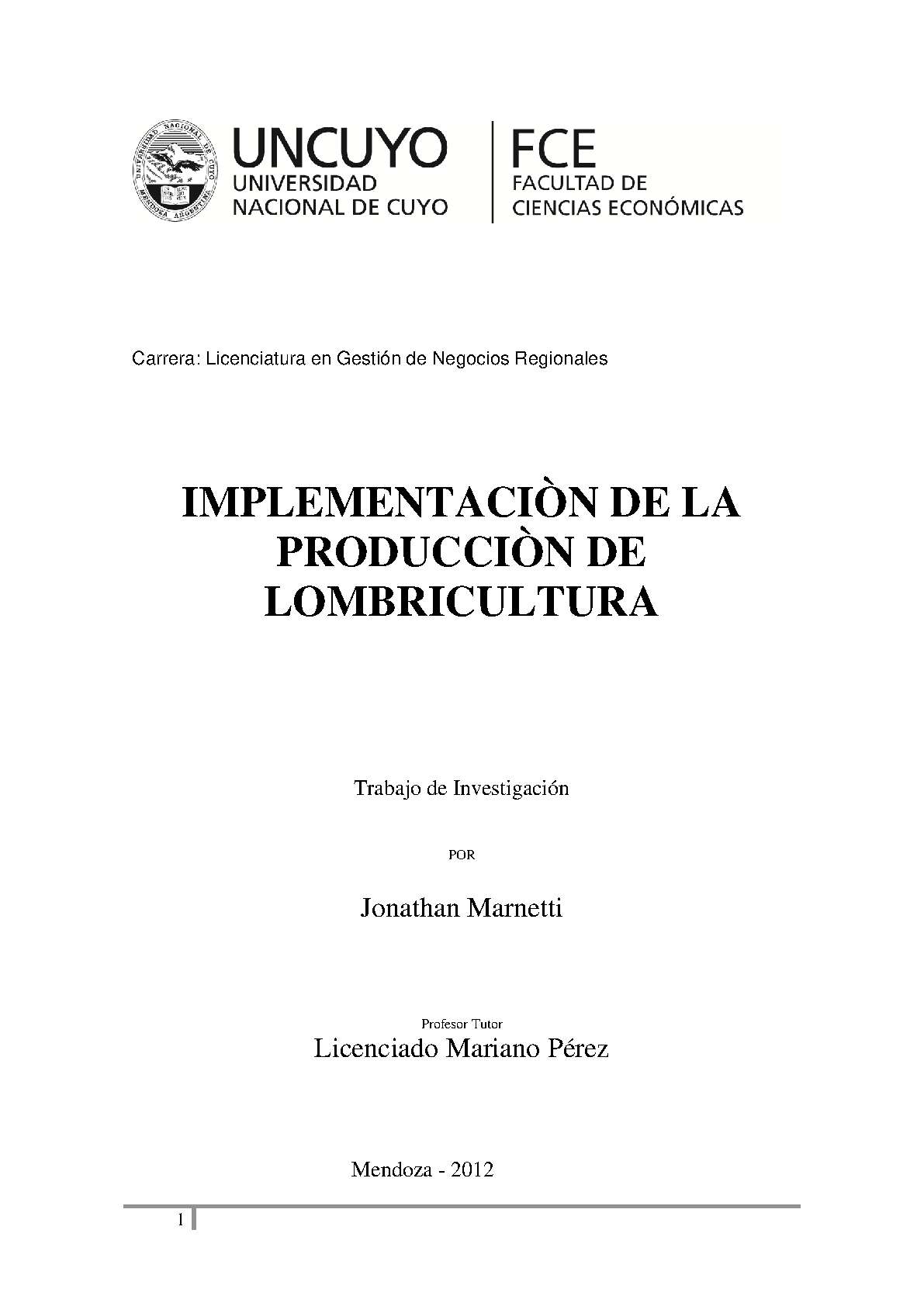 Marnetti, Jonathan. (2012). Implementación de la producción de lombricultura: (Trabajo final de grado). Mendoza, Universidad Nacional de Cuyo. Facultad de Ciencias Económicas.