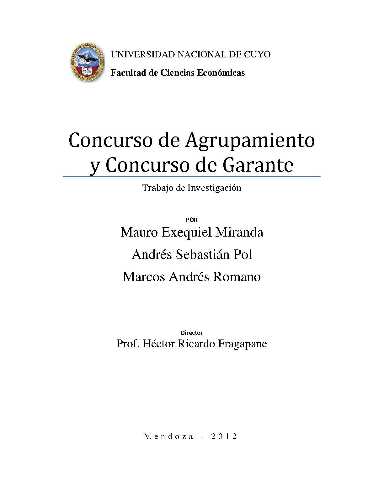 Miranda, Mauro Exequiel; Pol, Andrés Sebastián; Romano, Marcos Andrés. (2012). Concurso de agrupamiento y concurso de garante: (Trabajo final de grado). Mendoza, Universidad Nacional de Cuyo. Facultad de Ciencias Económicas.