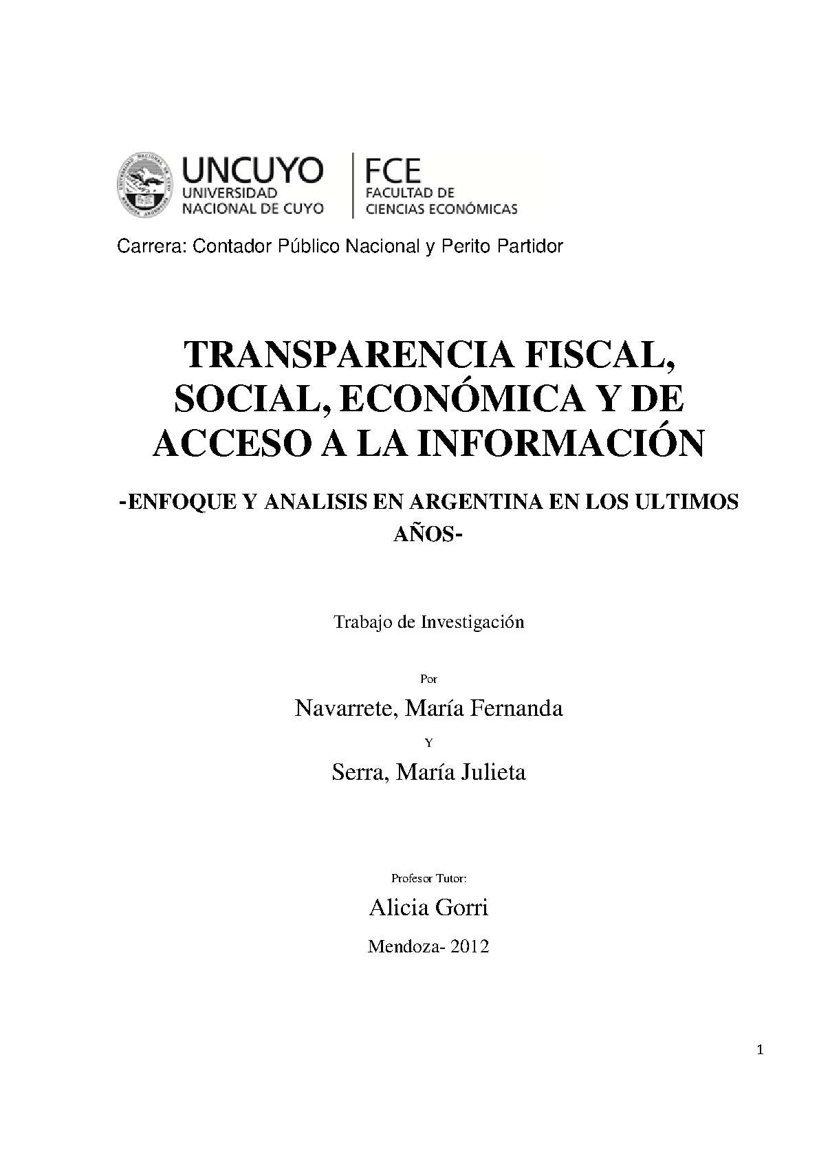 argentino, ya que la transparencia gubernamental es sumamente importante en todos los niveles de gobierno, nacional, provincial y también municipal debido a la mayor cercanía del ciudadano con los decisores de la política, posibilitando esto un mayor control de los actos públicos. En el mismo analizamos la transparencia, la equidad y la eficiencia en el uso de los fondos públicos, en el marco de la solvencia fiscal y la democratización de la toma de decisiones presupuestarias; recalcando la importancia
