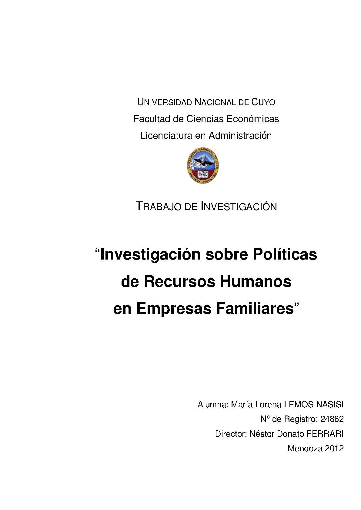 Lemos Nasisi, María Lorena. (2012). Investigación sobre políticas de recursos humanos en empresas familiares: (Tesina de grado). Mendoza, Universidad Nacional de Cuyo. Facultad de Ciencias Económicas.