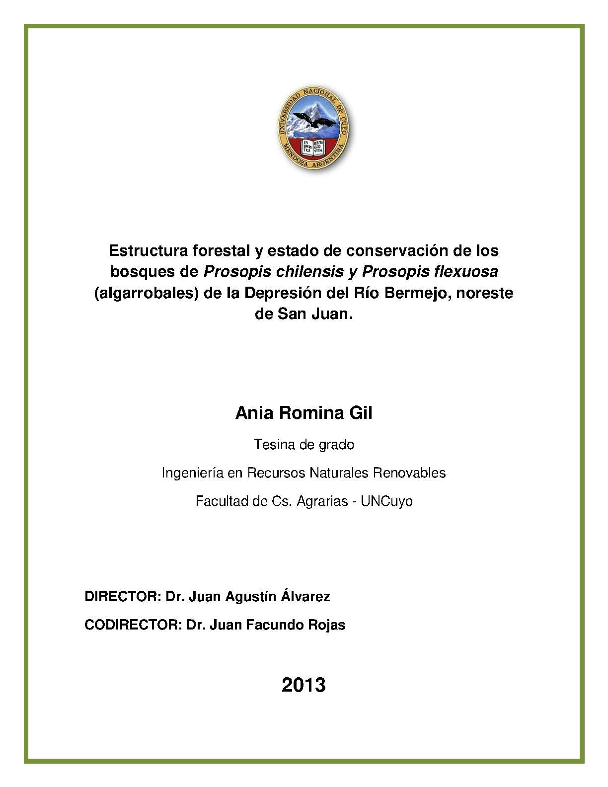 Gil, Ania Romina. (2013). Estructura forestal y estado de conservación de los bosques de Prosopis chilensis y Prosopis flexuosa (algarrobales) de la Depresión del Río Bermejo, noreste de San Juan: (Tesina de grado). Mendoza, Universidad Nacional de Cuyo. Facultad de Ciencias Agrarias .
