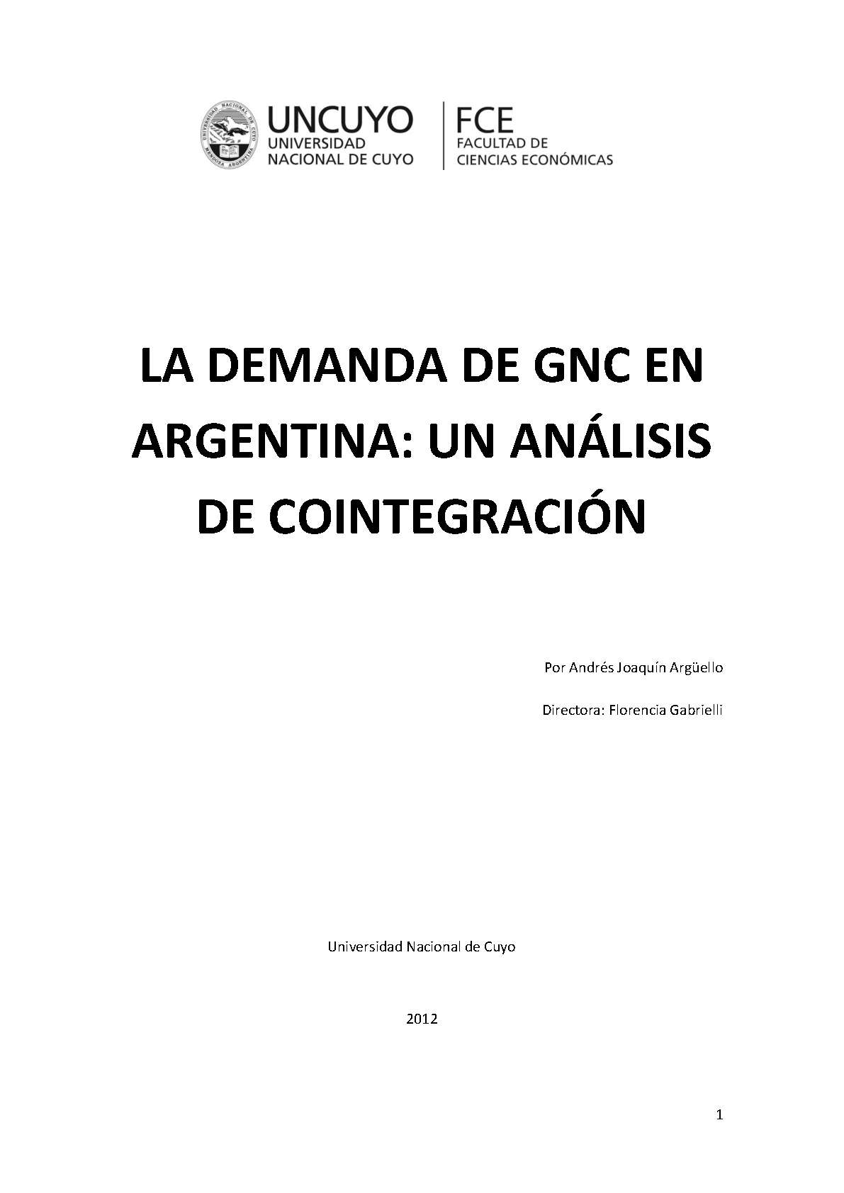 Argüello, Andrés Joaquín. (2012). La demanda de GNC en Argentina: un análisis de cointegración (Trabajo final de grado). Mendoza, Universidad Nacional de Cuyo. Facultad de Ciencias Económicas.