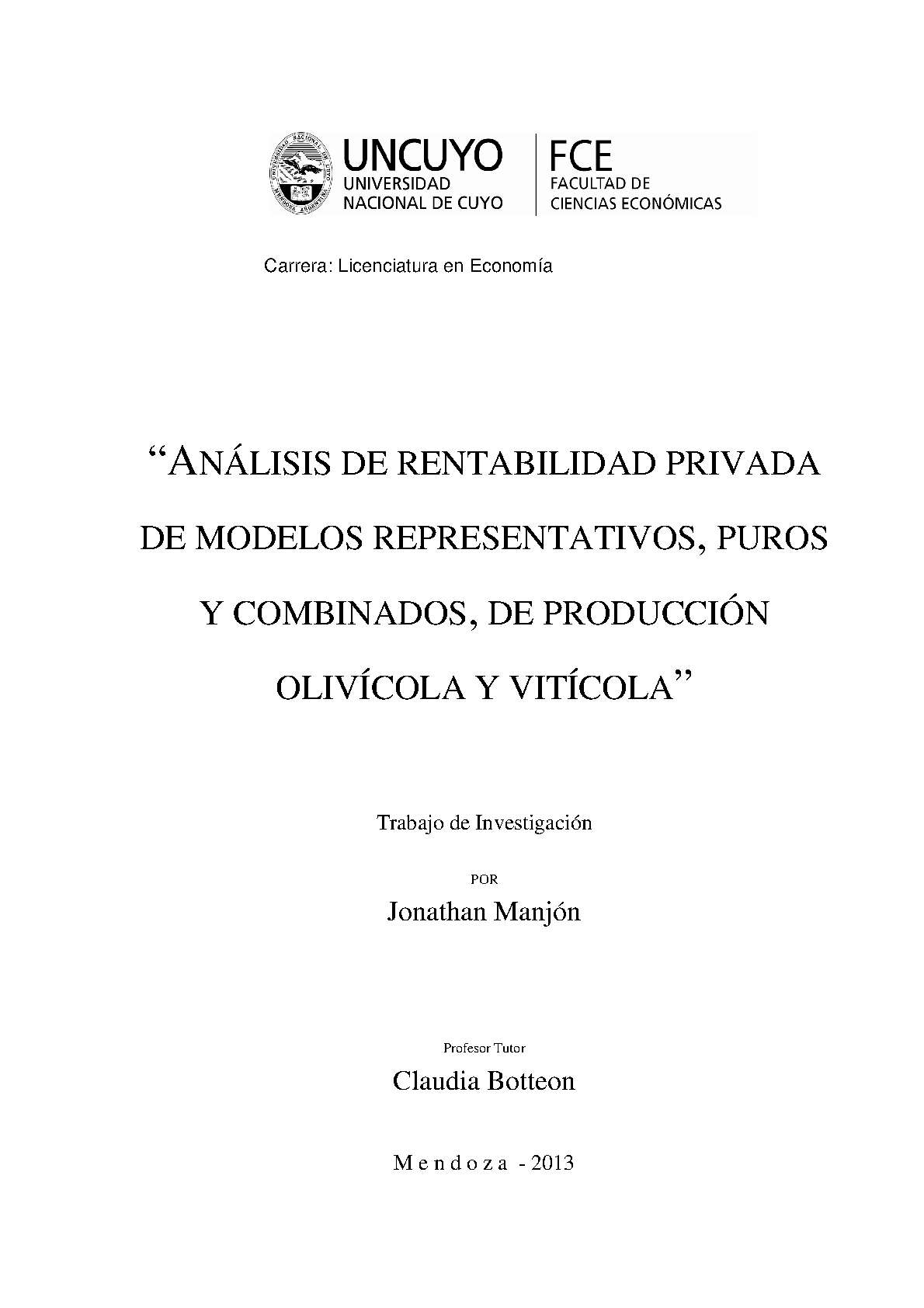 Manjón, Jonathan. (2013). Análisis de rentabilidad privada de modelos representativos, puros y combinados, de producción olivícola y vitícola: (Trabajo final de grado). Mendoza, Universidad Nacional de Cuyo. Facultad de Ciencias Económicas.
