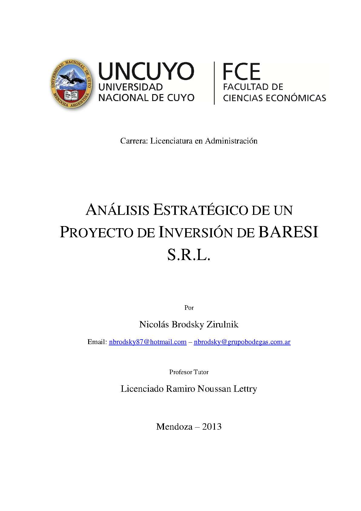 Brodsky Zirulnik, Nicolás. (2013). Análisis estratégico de un proyecto de inversión de Baresi S.R.L.: (Trabajo final de grado). Mendoza, Universidad Nacional de Cuyo. Facultad de Ciencias Económicas.