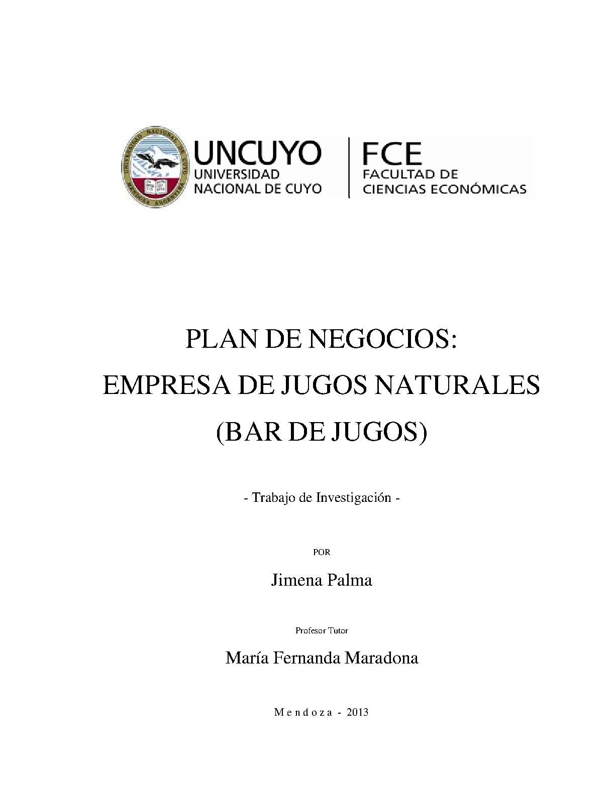 Este estudio trata acerca de la implentación en la ciudad de Mendoza de un negocio bajo el concepto de bar de jugos (juice bar). El plan de negocios contiene todos los aspectos necesarios para determinar su viabilidad económica, financiera, técnica y comercial.