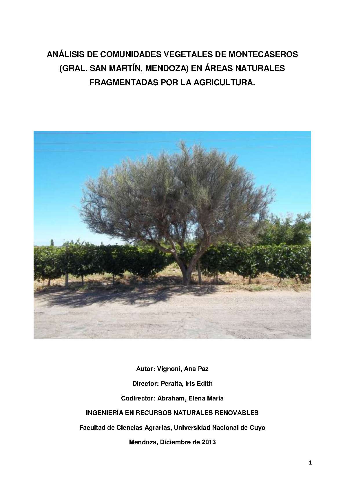 Vignoni, Ana Paz. (2013). Análisis de comunidades vegetales de Montecaseros (Gral. San Martín, Mendoza) en áreas naturales fragmentadas por la agricultura: (Tesina de grado). Mendoza, Universidad Nacional de Cuyo. Facultad de Ciencias Agrarias .