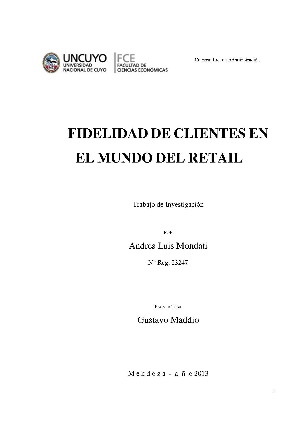 Mondati, Andrés Luis. (2013). Fidelidad de clientes en el mundo del retail: (Trabajo final de grado). Mendoza, Universidad Nacional de Cuyo. Facultad de Ciencias Económicas.
