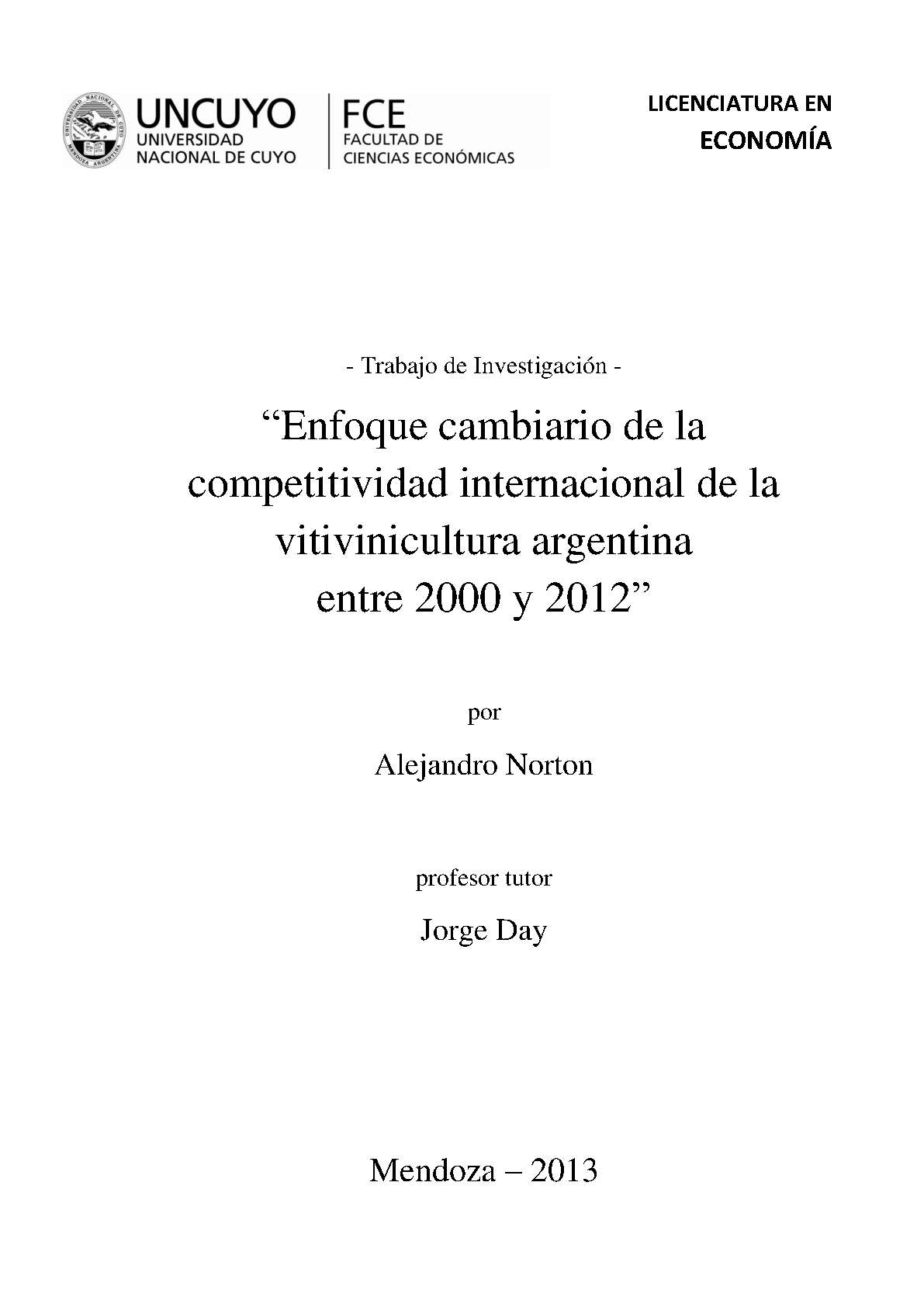 Norton, Alejandro. (2013). Enfoque cambiario de la competitividad internacional de la vitivinicultura argentina entre 2000 y 2012: (Trabajo final de grado). Mendoza, Universidad Nacional de Cuyo. Facultad de Ciencias Económicas.