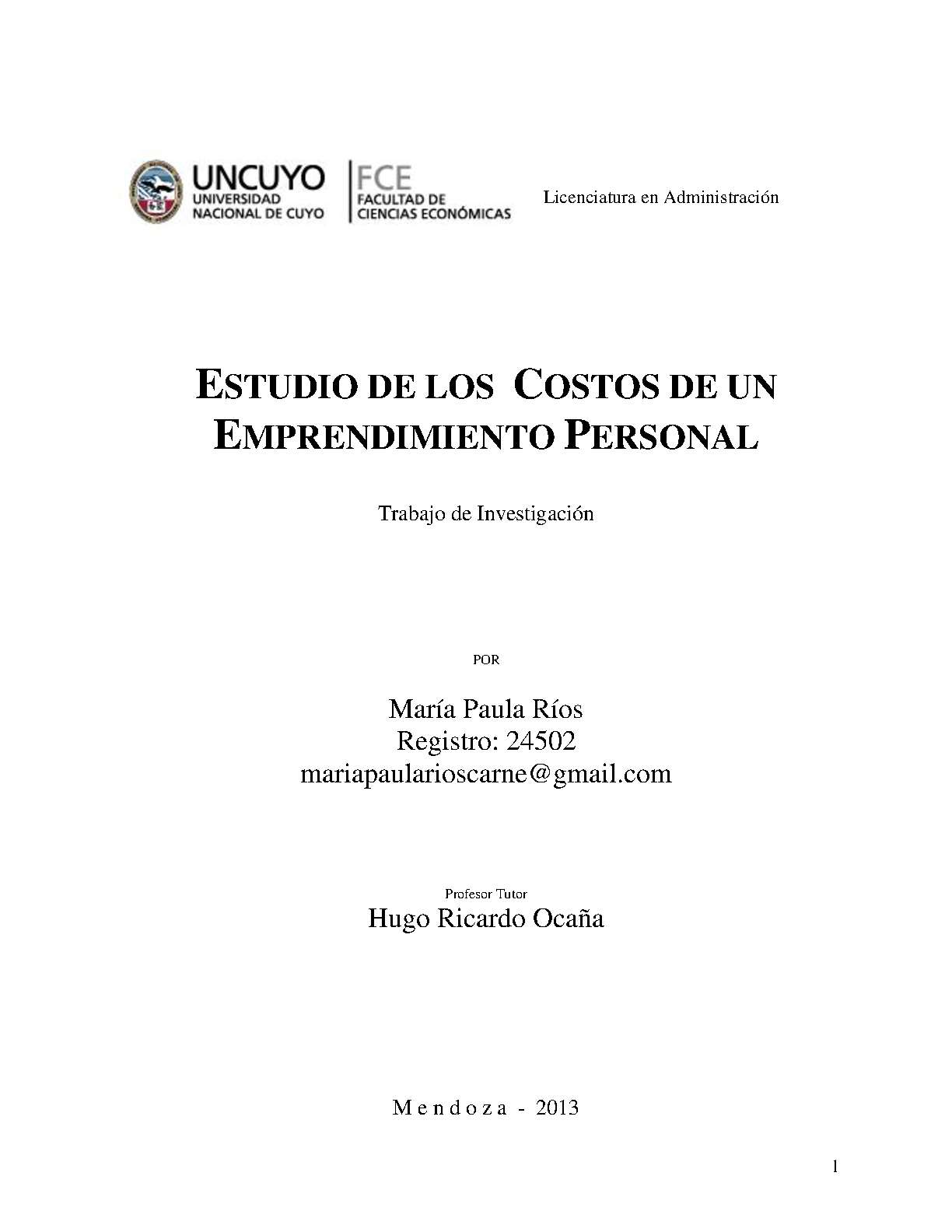 Ríos, María Paula. (2013). Estudio de los costos de un emprendimiento personal: (Trabajo final de grado). Mendoza, Universidad Nacional de Cuyo. Facultad de Ciencias Económicas.