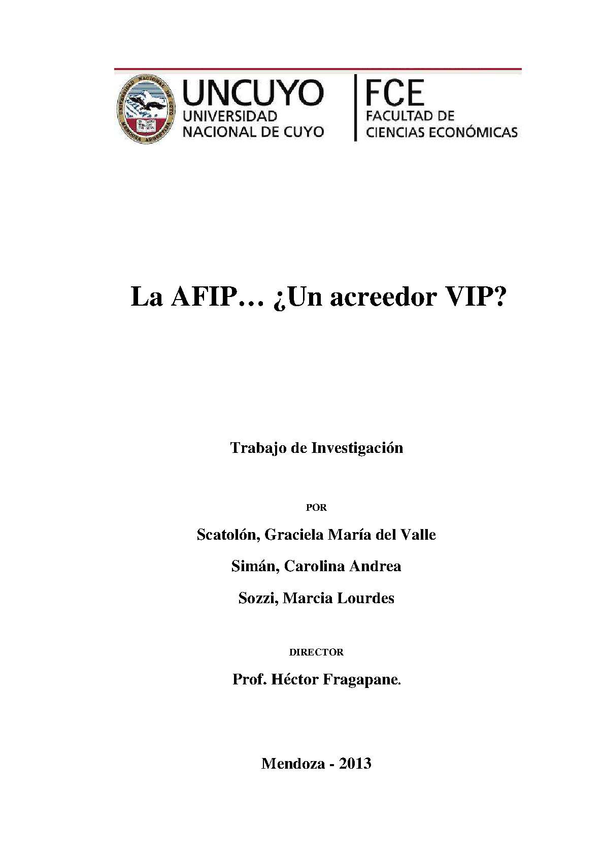 Scatolón, Graciela María del Valle; Simán, Carolina Andrea; Sozzi, Marcia Lourdes. (2013). La AFIP… : ¿un acreedor VIP? (Trabajo final de grado). Mendoza, Universidad Nacional de Cuyo. Facultad de Ciencias Económicas.