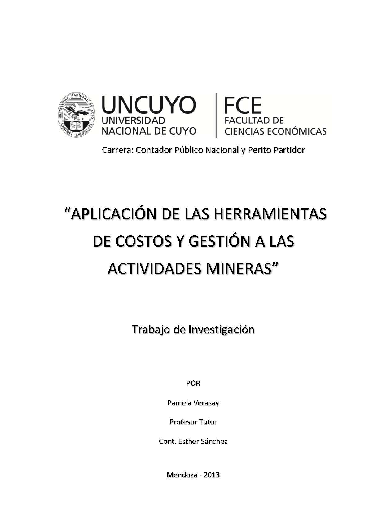 Verasay, Pamela. (2013). Aplicación de las herramientas de costos a las actividades mineras: (Trabajo final de grado). Mendoza, Universidad Nacional de Cuyo. Facultad de Ciencias Económicas.