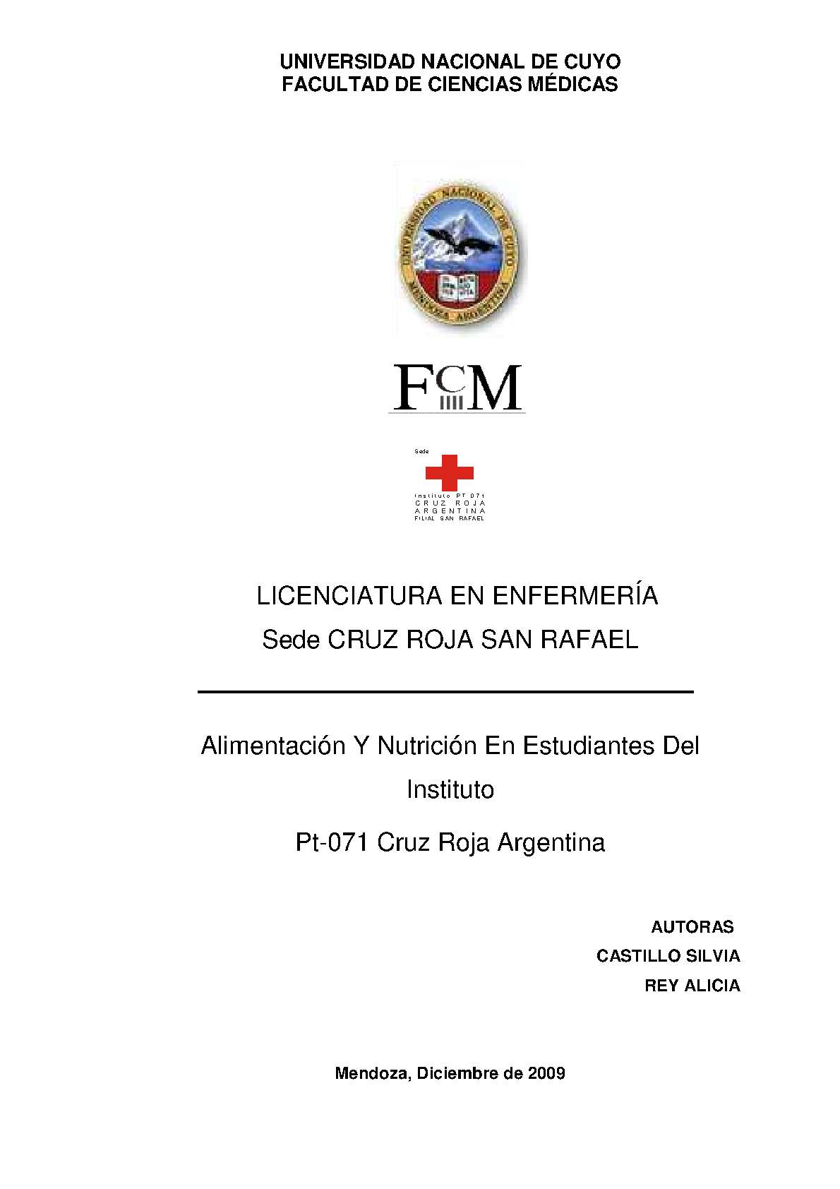 Castillo, Silvia; Rey, Alicia. (2009). Alimentación y nutrición en estudiantes del Instituto Pt-071 Cruz Roja Argentina: (Tesina de grado). Mendoza, Universidad Nacional de Cuyo. Facultad de Ciencias Médicas. Escuela de Enfermería..