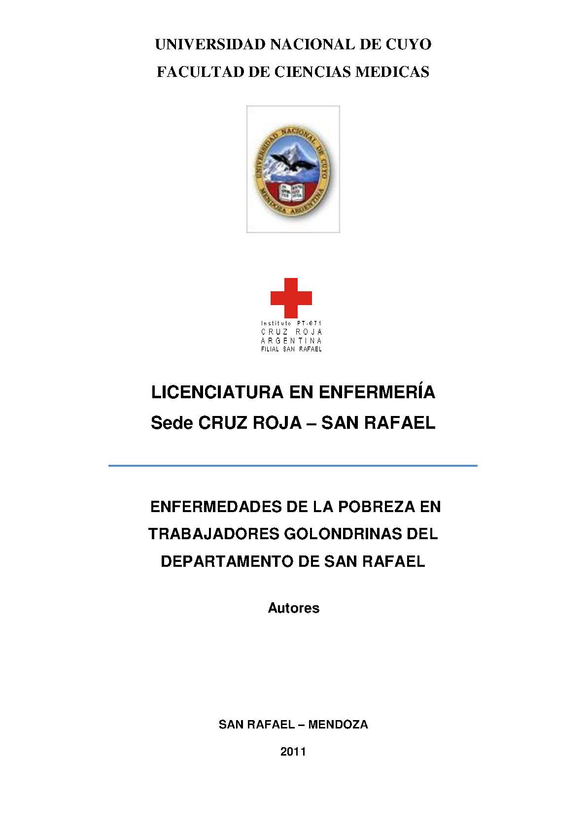 Alarcon, Domingo; Borbón, Carina. (2011). Enfermedades de la pobreza en trabajadores golondrinas del departamento de San Rafael: (Tesina de grado). Mendoza, Universidad Nacional de Cuyo. Facultad de Ciencias Médicas. Escuela de Enfermería..