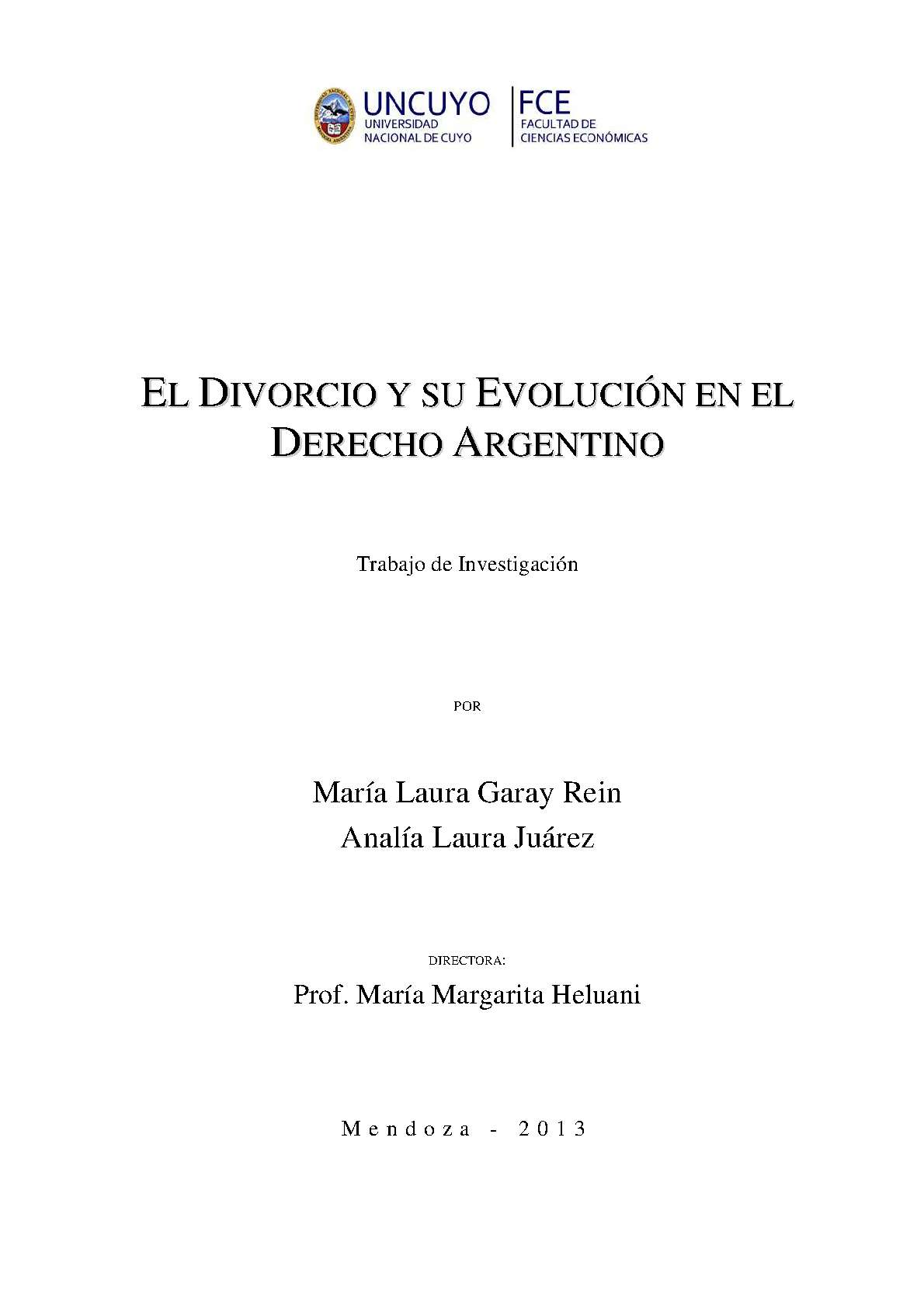 Garay Rein, María Laura; Juárez, Analía Laura. (2013). El divorcio y su evolución en el derecho argentino: (Trabajo final de grado). Mendoza, Universidad Nacional de Cuyo. Facultad de Ciencias Económicas.