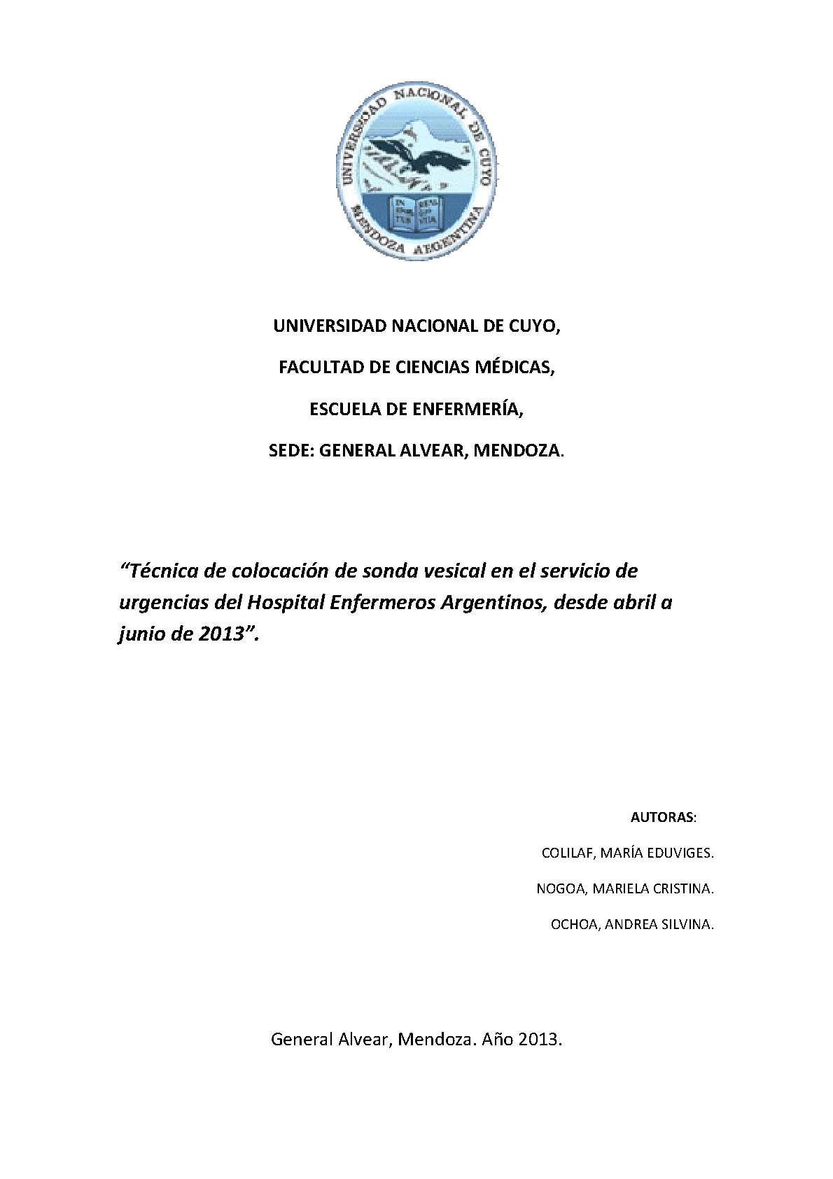Colilaf, María Eduviges; Nogoa, Mariela Cristina; Ochoa, Andrea Silvina. (2013). Técnica de colocación de sonda vesical en el servicio de urgencias del Hospital Enfermeros Argentinos: desde abril a junio de 2013 (Tesina de grado). Mendoza, Universidad Nacional de Cuyo. Facultad de Ciencias Médicas. Escuela de Enfermería..